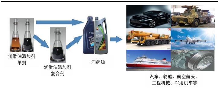 润滑油添加剂一般占润滑油总体比例约2%-30%左右。润滑油添加剂行业的上游是石油化工行业,主要有基础油、异辛醇、五硫化二磷、苯乙烯、氧化锌、四聚丙烯;添加剂行业的下游主要是润滑油行业,主要应用各领域包括可广泛用于汽车发动机(包括天然气发动机)润滑油、航空航天发动机油、铁路机车发动机油、船舶发动机油、工业润滑油、润滑脂、乳化炸药等领域。