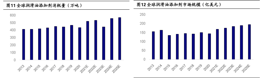 润滑油添加剂市场规模很大,预计到2025年全球润滑油添加剂市场规模达到195亿美元。根据机构预期2025年,全球润滑油添加剂消耗量将增加至570万吨,市场规模约为195亿美元。中国每年润滑油添加剂市场需求在100万吨左右,是全球单一市场最大的需求国。