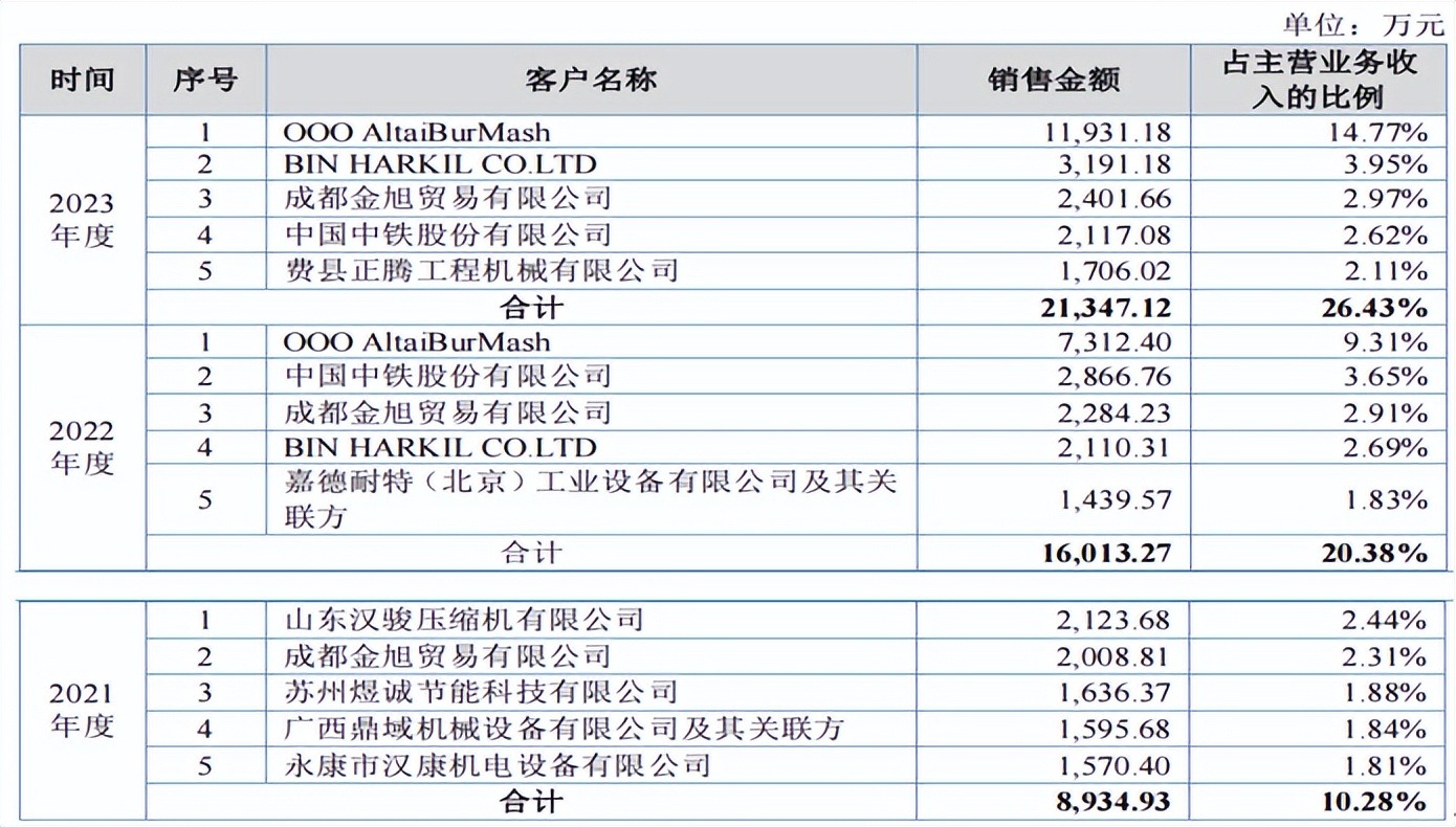 费县正腾工程机械有限公司为2023年新增前五大客户,中国中铁股份有限公司为2022年新增前五大客户,嘉德耐特(北京)工业设备有限公司及其关联方为2022年新增前五大客户,OOOAltaiBurMash为2022年新增前五大客户,其于2022年成为公司俄罗斯区域授权经销商;BINHARKILCO.LTD为2022年新增前五大客户,其系公司沙特区域授权经销商。上述客户所在区域对矿山开采、工程建设有较强的需求同时上述客户均有较强的销售资源和能力,公司向其销售一体式钻机规模较大相应导致上述客户销售金额逐年上升。