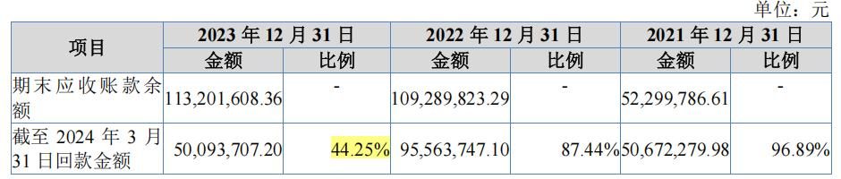 2022年末应收账款账面余额占营业收入比例较高,主要是一方面受社会公共卫生事件影响,2022年底部分经销商未能按合同约定在年底及时结清当年货款,应收余额增加;另一方面当年下半年公司对境内部分直销客户及境外沙特阿拉伯客户销售收入较大,上述客户主要采购钻机、金额较大,应收账款相应有所增加。2023年末应收账款账面余额占营业收入比例较高,主要是当年四季度公司对部分境外客户销售收入较大,上述客户主要采购钻机、金额较大,应收账款相应有所增加。