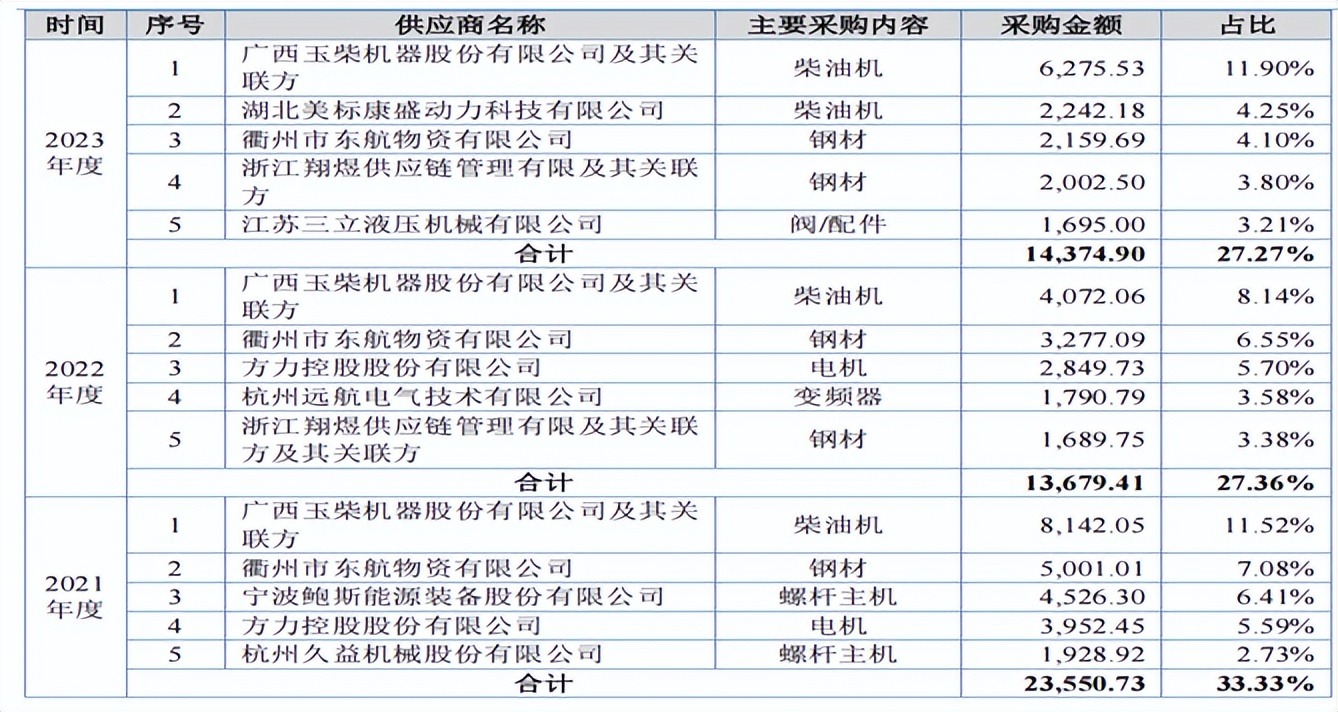 湖北美标康盛动力科技有限公司、江苏三立液压机械有限公司为2023年公司新增前五大供应商;杭州远航电气技术有限公司为2022年公司新增前五大供应商;浙江翔煜供应链管理有限及其关联方为2022年公司新增前五大供应商。
