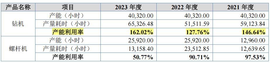 报告期内,志高机械钻机产能利用率一直处于较高水平,分别为146.64%、127.76%和162.02%。2023年公司钻机产能利用率较高,主要是由于下游市场需求较大、产量有所上升,同时零件数量较多、生产工艺较为复杂、耗时相对较多的一体式钻机销量上升为521台,高于2021年、2022年的484台、452台,相应导致产能利用率较高。