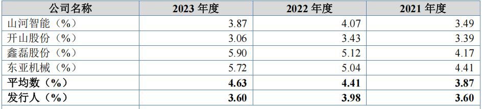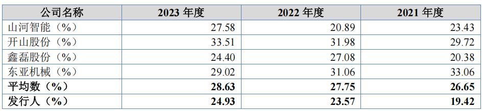 报告期内,志高机械主营业务毛利率分别为19.42%、23.57%、24.93%,低于可比同行均值26.65%、27.75%和28.63%。