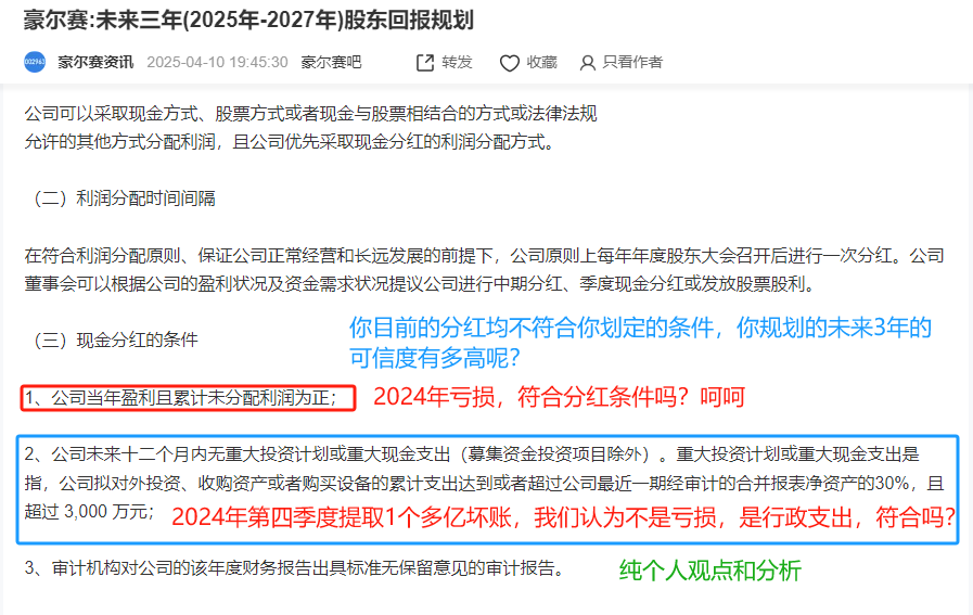 其基本面是非常差的,不是产业链和供应链中的闭环环节!只能是靠一些的手段来进行维护股价的操作,这就是其公告中展现未来描绘未来,又承诺分红的原因所在!但是瑕疵很多,分红是预留的很多说词缺口的,会用这些回复股民的,没有实质性的可操作的东西,只是给了自己一些借口,做到了其自己的有章可循,因为条款说的还是比较细的,那么这些条款在实操中会很容易的就会被打破,基本相当于是不设防的对其有利的一面,而对股民一点好处和利益是没有的,股民的利益还是得不到保障和保全!