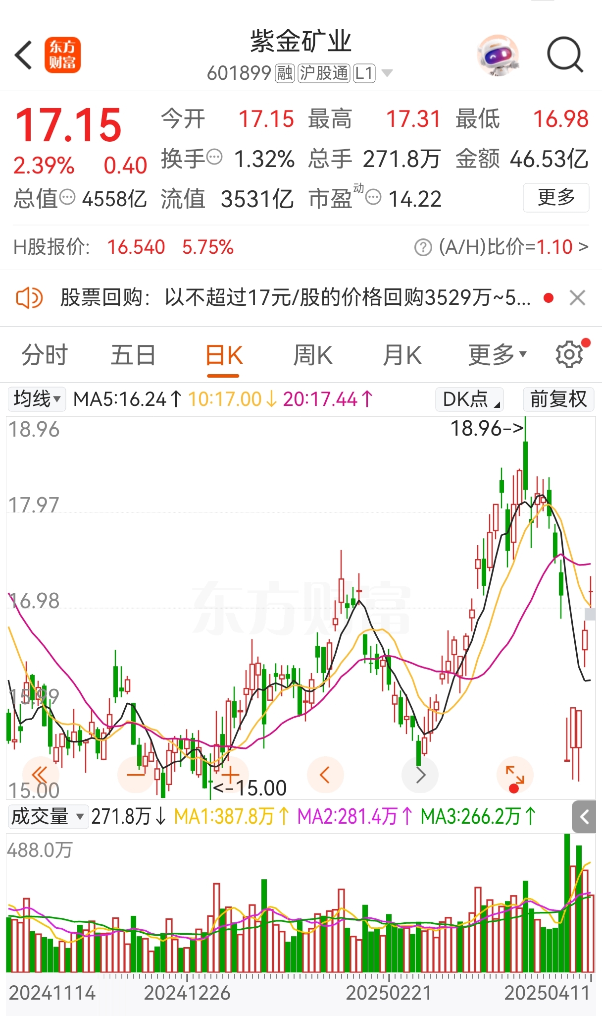 好了,根据这个结论我们可以推导出来现在的黄金股被严重低估了!是不是这样?我们看一看金价和金矿股的走势就知道,以紫金矿业为例来做一个比较,紫金矿业最大的矿藏是铜,其次是金,但是金价的弹性更高,而且紫金矿业的矿产金未来的增量远高于铜。结论是,看紫金矿业的业绩主要看金铜。