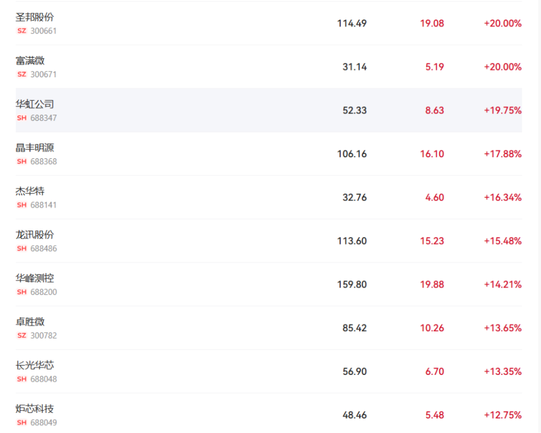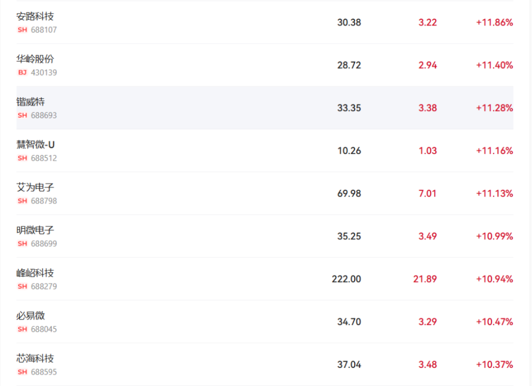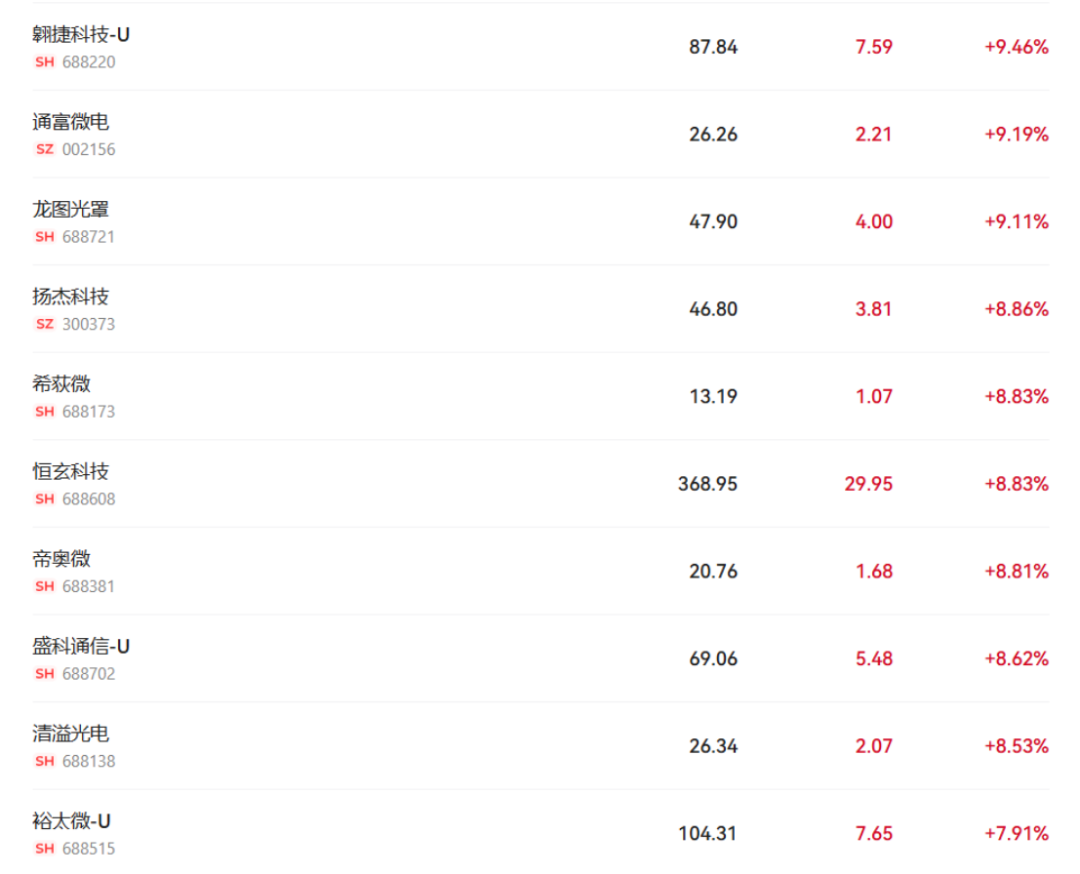 唯捷创芯、晶华微、纳芯微、思瑞浦、圣邦股份、富满微等一度涨超20%。