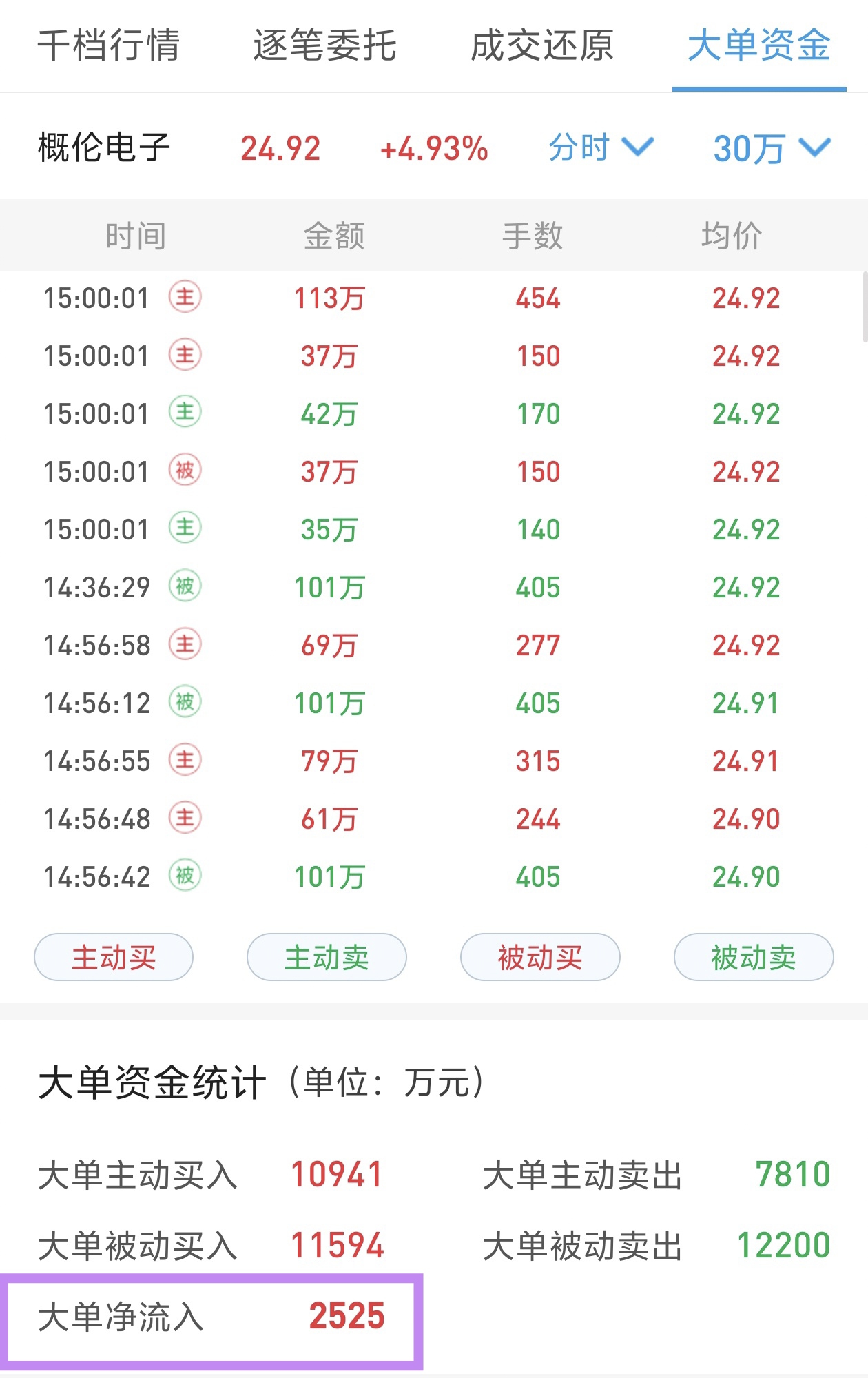 大单净流入2500w
