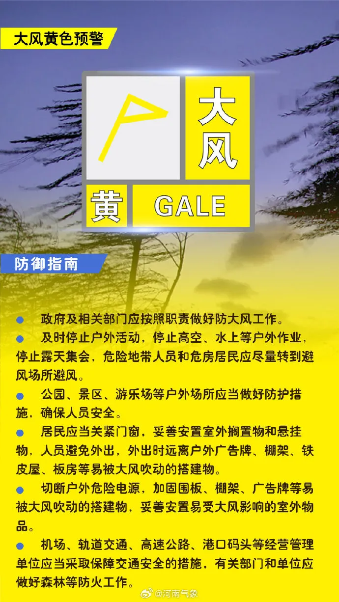 针对大风天气过程,河南省气象部门早先发布大风黄色预警,并同步启动重大气象灾害(大风)Ⅲ级应急响应。截至4月12日6时21分,河南全省生效中的大风、寒潮、雷暴大风等预警信号达105条。郑州方特旅游度假区、郑州园博园等多个景区发布临时闭园公告,河南宝泉旅游度假区、洛阳老君山景区等启动限流措施。