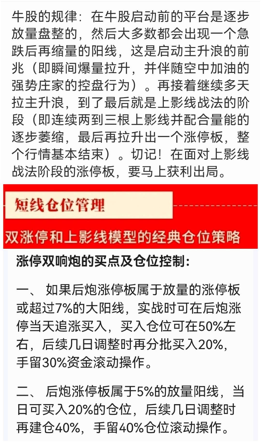 牛股的规律:在牛股启动前的平台是逐步放量盘整的,然后大多数都会出现一个急跌后再缩量的阳线,这是启动主升浪的前兆(即瞬间爆量拉升,并伴随空中加油的强势庄家的控盘行为)。再接着继续多天拉主升浪,到了最后就是上影线战法的阶段(即连续两到三根上影线并配合量能的逐步萎缩,最后再拉升出一个涨停板,整个行情基本结束)。切记!在面对上影线战法阶段的涨停板,要马上获利出局。