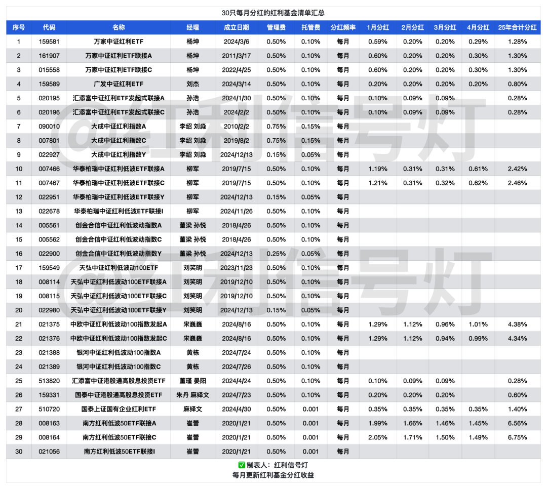 「红利信号灯」认真查询了超过200只的红利基金,从中找出30只「每月分红」型的红利基金。