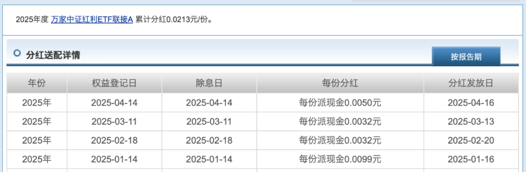 2025年度,万家中证红利ETF联接A累计分红0.0213元/份,合计分红收益1.30%。