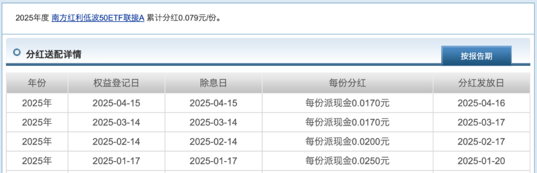 2025年度,南方红利低波50ETF联接A累计分红0.079元/份,合计分红收益6.56%。