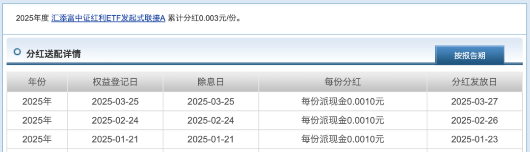 2025年度,汇添富中证红利ETF发起式联接A累计分红0.003元/份,合计分红收益0.28%。