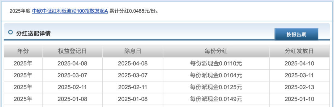 2025年度,中欧中证红利低波动100指数发起A累计分红0.0488元/份,合计分红收益4.38%。