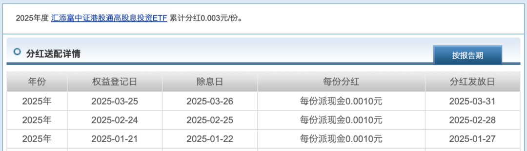 2025年度,汇添富中证港股通高股息投资ETF累计分红0.003元/份,合计分红收益0.28%。