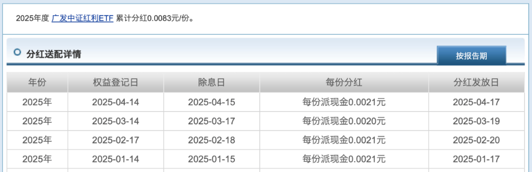 2025年度,广发中证红利ETF累计分红0.0083元/份,合计分红收益0.80%。