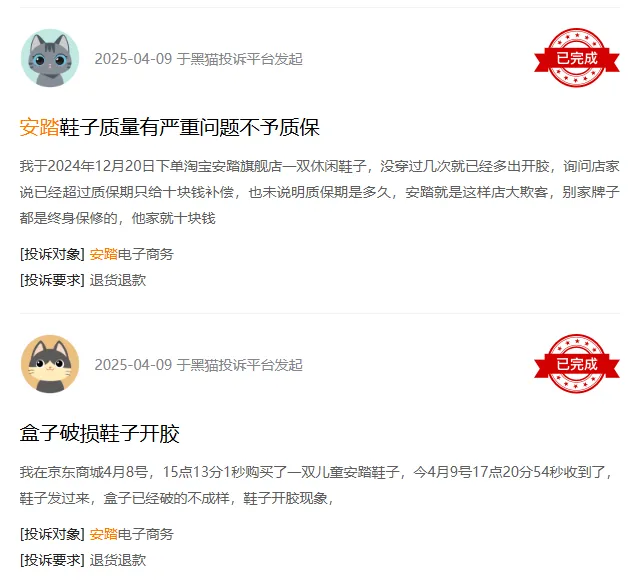这并非孤例,鞋面开裂、开胶、产品不舒适等现象层出不穷,近期甚至有愈演愈烈的趋势。目前,黑猫投诉平台涉及安踏的投诉有8594条,主要集中在鞋底开胶、服装起球等。