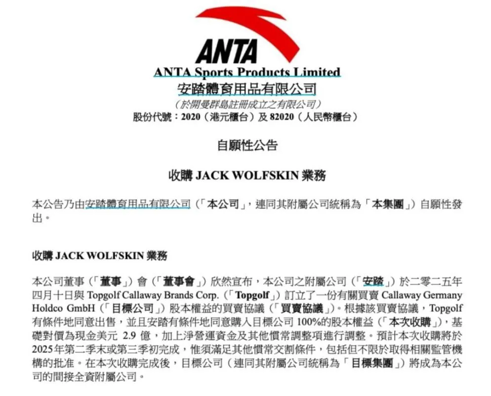 4月10日,安踏又出手了,全资收购德国品牌Jack Wolfskin(狼爪),收购价2.9亿美元,折合人民币约21亿元,在其品牌拼图中再添一块。