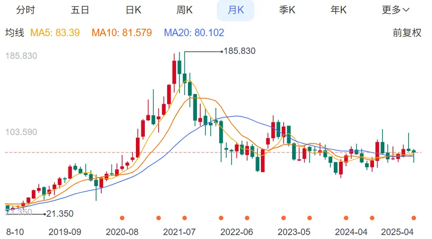 2021年8月,安踏股价一度冲上180港元(前复权价),市值突破5000亿港元,但此后持续回调,南向资金和股东频繁减持。