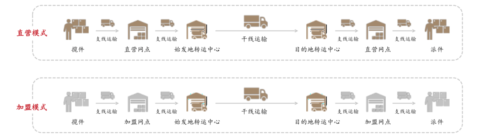 直营模式:快递公司直接经营揽收、分拣、转运和派送等整个端到端物流链条。该模式下,快递公司自建含末端网点在内的整个物流网络,对各环节均有较强掌控力。