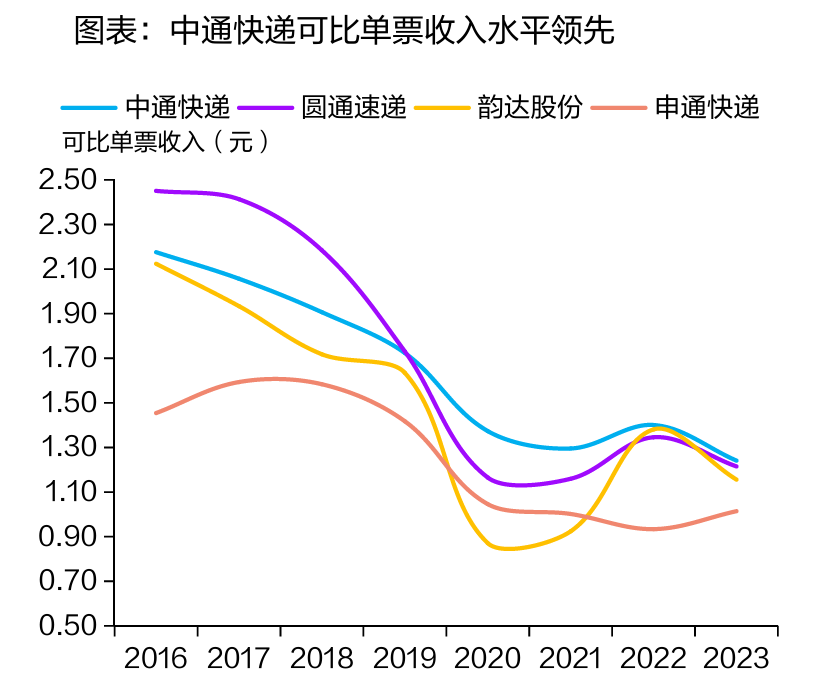由于在干线运输和转运中(加盟制快递公司的主要负责区域),中通基本完成全部自营(其他三家仍存在部分加盟),速度和质量相对更好,这导致在邮政局的统计中,中通的满意度在“三通一达”中排名最高,更多客单价较高的客户也倾向于选择中通,使得中通的单票收入相较于另外三家要高一些。