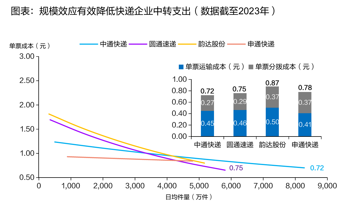 其次,中通早些年大量购入土地、设备、车辆等,使得其相对近几年才构建的企业,摊销、折旧成本更低。同时,转运中心的自营使得中间损耗减少,干线运输中高运力车型的使用使得其单次运输量单次运输量是普通车辆的2倍,成本仅为70%。除这些措施外,自动化和规模效应也进一步降低了成本。