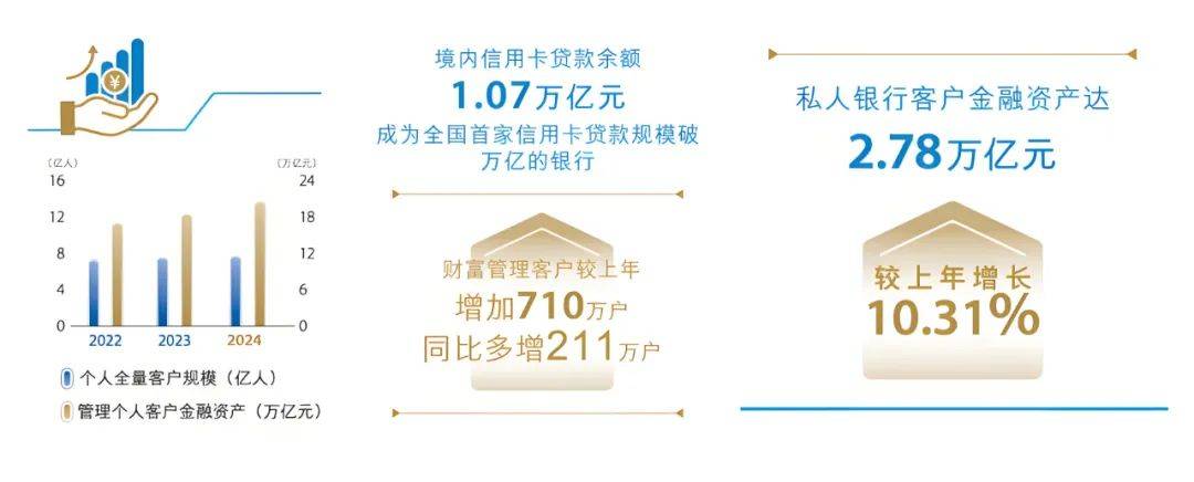 2024年财报提到,在推动“洞察升级”方面,建设银行打造资产负债综合视图,助力对私客户经理开展一站式综合服务;在推动“货架升级”方面,推出产品优选和精准画像工具;在“权益升级”方面,做出了创新研发贵金属优惠券等金融权益的亮点,全年累计回馈4.28亿人次;在推动“运营升级”和“工具升级”方面,分别建设企业级集约化营销运营能力、打造“帮得”客户经理智能助理。这样的全方位升级,保证了建设银行每一个细分产品都能为客户提供专业的金融支持。