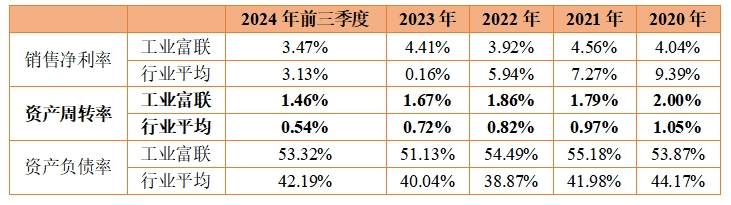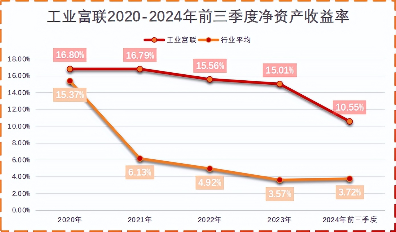 更深入一点,我们研究企业筹资、投资、日常运营等活动的效率常用净资产收益率(ROE)来衡量,而在ROE方面工业富联相较于整个行业是比较强势的。自2021年起,工业富联ROE均为行业平均水平的3-5倍,保持在10%-17%左右。