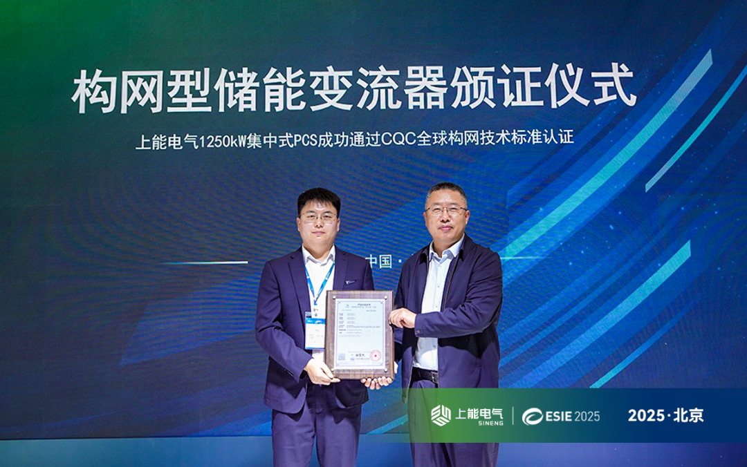 在ESIE展会首日,上能电气1250kW集中式构网型PCS产品荣获中国质量认证中心(以下简称CQC)颁发的构网型储能变流器认证证书,标志着上能电气在构网技术的创新领先性再度得到权威机构的肯定。