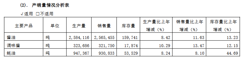 从各产品类型的销量数据看,酱油和调味酱的销量同比增速是高于营收增速的,说明产品是降价了的。耗油价格基本不变。说明调味品赛道还是处于竞争之中的,而且与通缩现象吻合。报告期末,公司产品库存同比上升,主要是春节销售旺季增加备货所致。
