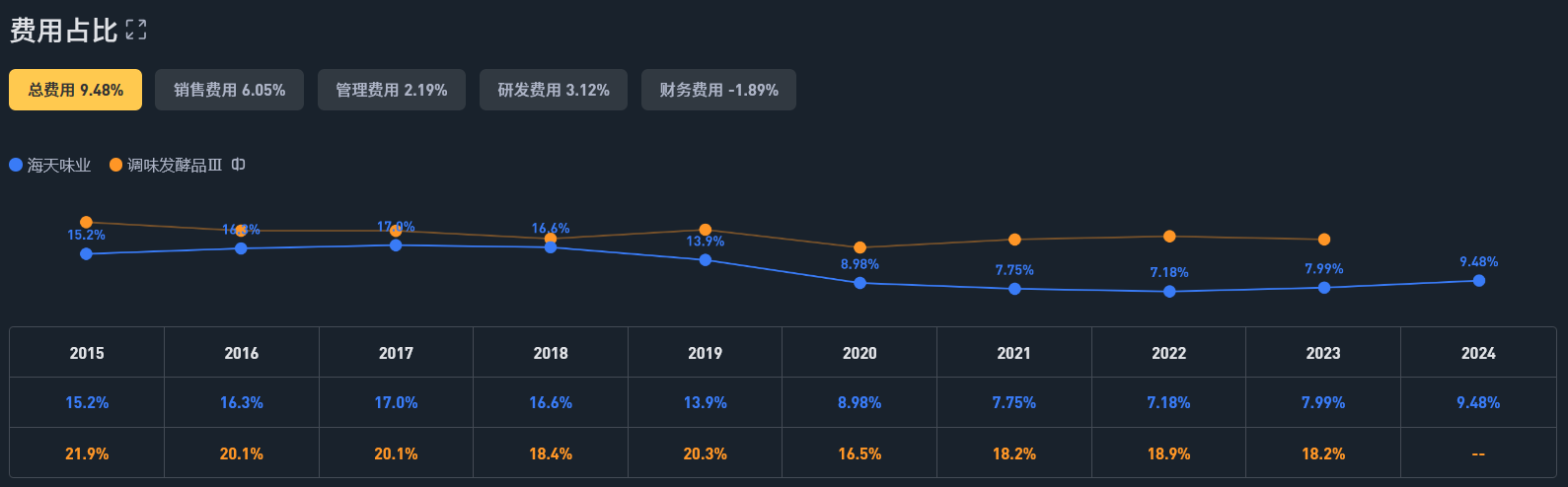 不过整体来说,海天的总费用率还是很低的,特别是对于快消品而言。只有9.48%。整体净利率由23%提升到23.6%,提升了0.6%。说明毛利率虽然提升了,但是费用率也提升了,所以净利率就变化不大。还是因为大环境通缩和竞争的原因。