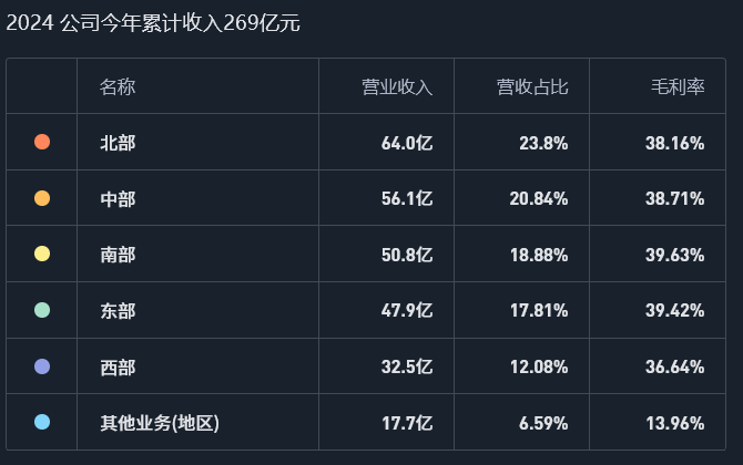 东南西北中各大区域,营收占比是接近的,毛利率也差不多,西部因为人口少原因占比最低。说明海天在全国范围内都是比较畅销的,没有明显的地域倾向。从增速来看,东部、南部和中部营收增速更快些。