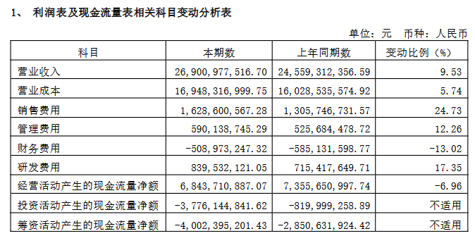 销售费用和研发费用增速较快,销售费用增加是本期人工支出和广告支出增加所致。研发费用增加,是本期研发材料耗用及研发人工支出增加所致。说明公司在加大研发和销售力度。