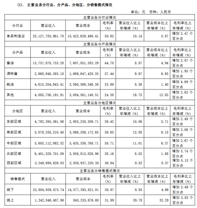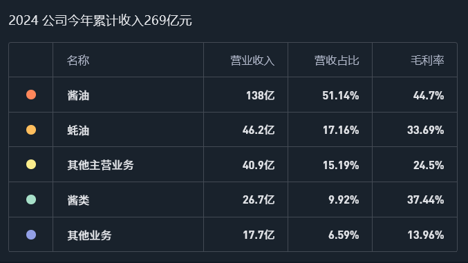 核心肯定是酱油、蚝油和调味酱,营收占比分别为51.14%、17.16%和9.92%。毛利率也是酱油最高,调味酱次之,蚝油最低。