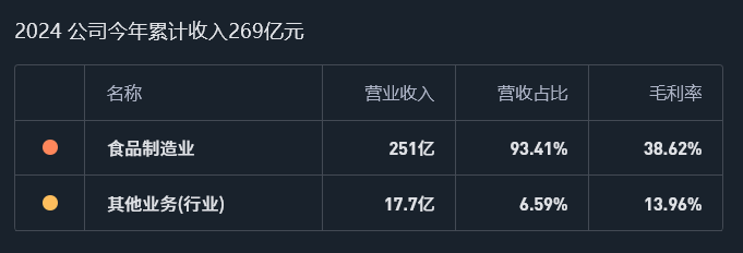 食品制造业是核心业务,营收占比93.41%,毛利率也更高,38.62%。其它业务财报中没有披露,从经营范围中猜测可能是信息咨询服务和食品互联网销售等。