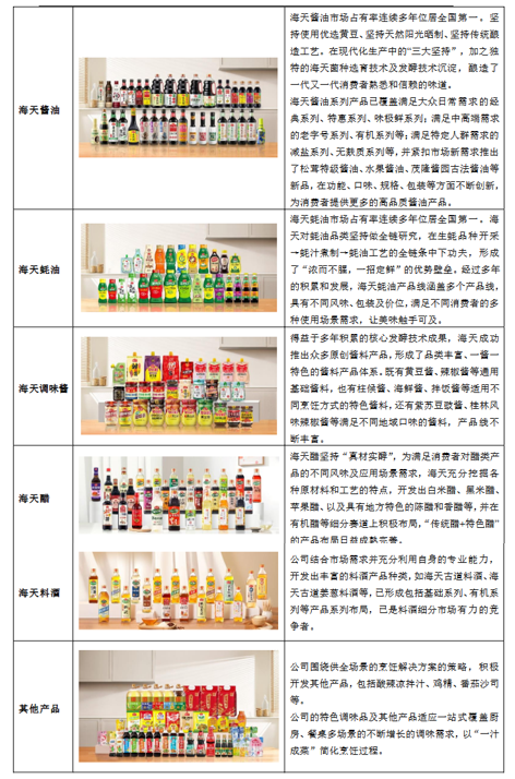 我们知道海天主要是酱油、蚝油、调味酱、醋、料酒等其它调味品,下图是这些产品矩阵。感兴趣的朋友,可以仔细看下。应该说基本上覆盖了调味品的各种品类。