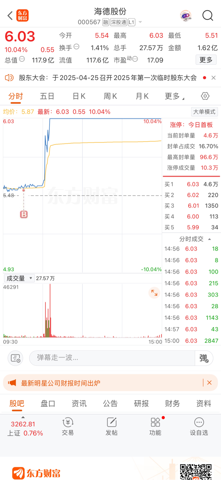 早盘阶段,老钱及时入场布局$海德股份(SZ000567)$