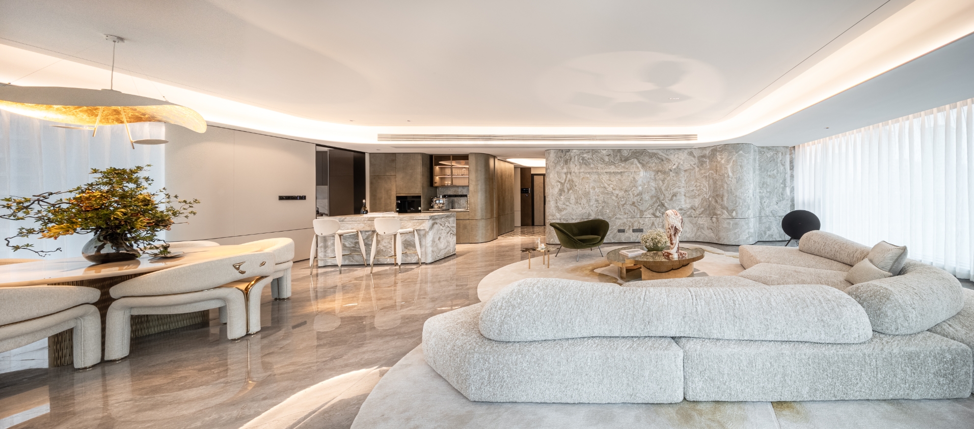 LDKB一体化宴会方厅,270环幕全景采光,以城市天幕极景为背景,仿佛置身旋转观景台。巨大的安第斯雪景奢石背景墙,为空间赋予奢华的质感,蒸烤一体化设计餐厨台可选配升降水龙头,健康、智能的生活理念根植于空间的每一处设计。