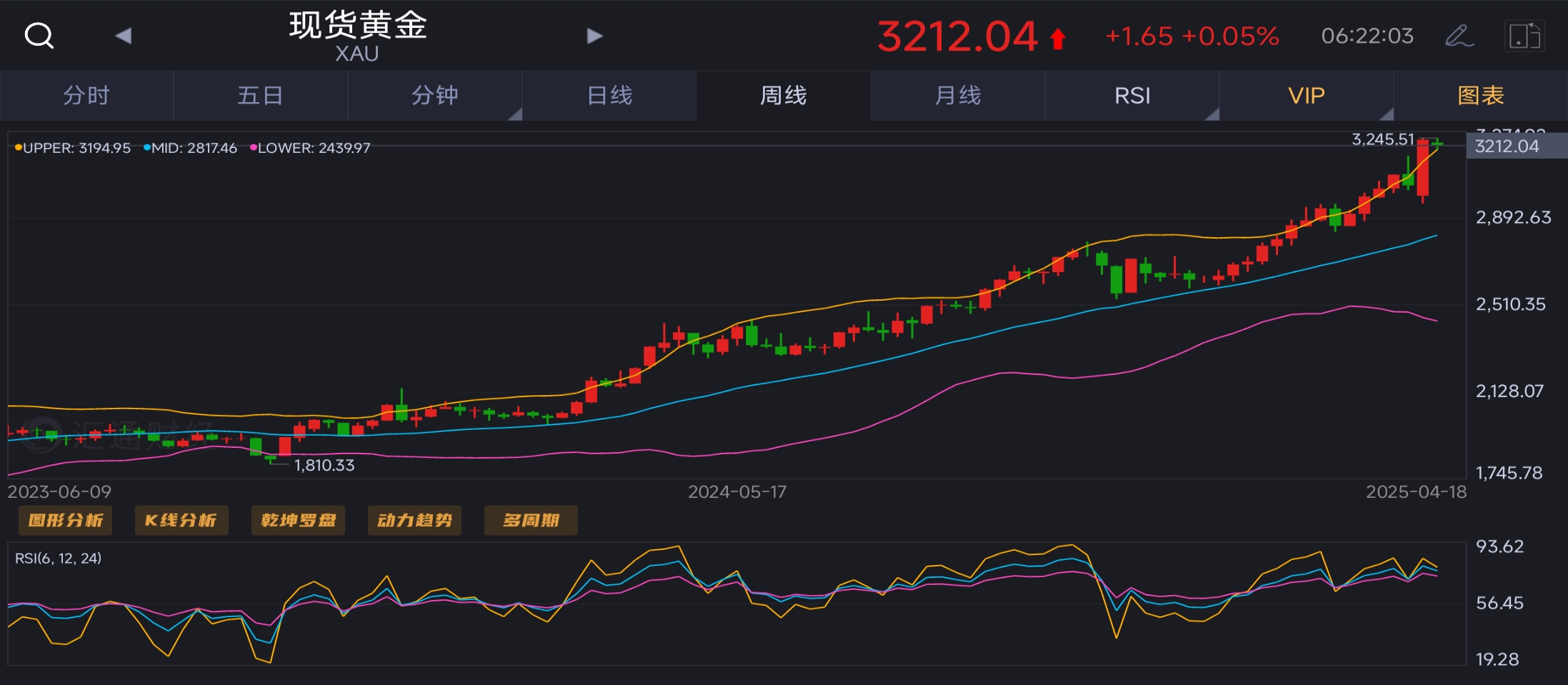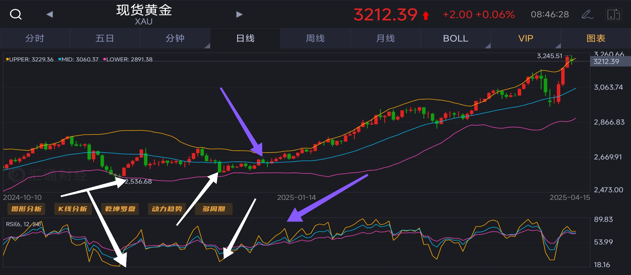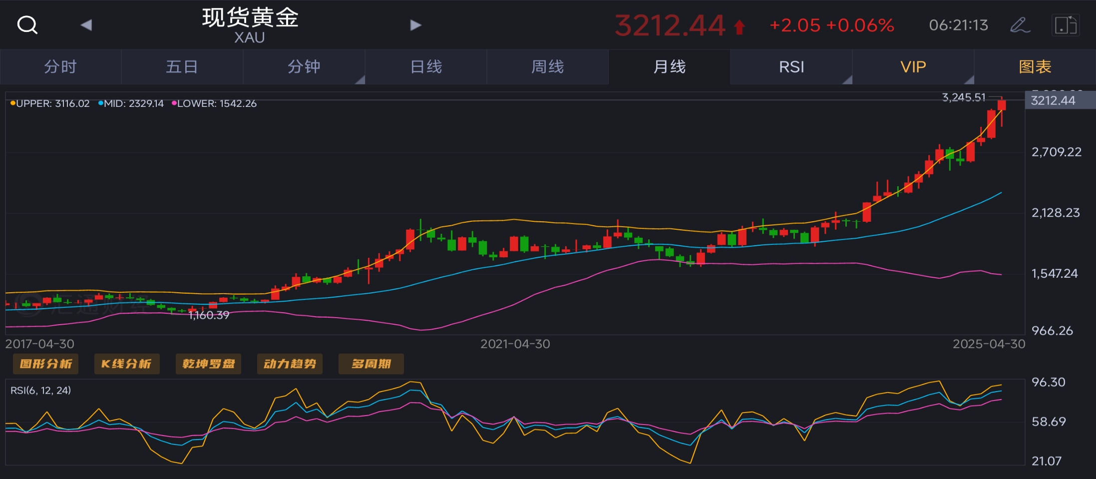 这幅年k线图形中,显示出2011年高点及之后的走势。可以看出2023年底及2024年的上涨,当前现货黄金价格已经突出年线上轨。当前的2025年价格继续上涨,已经完全站在上轨之外(之上)了。
