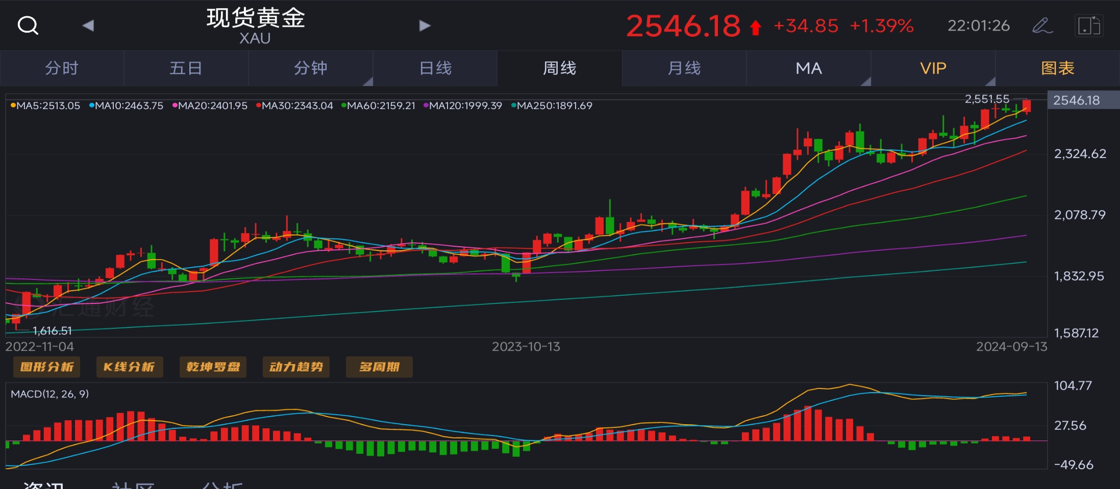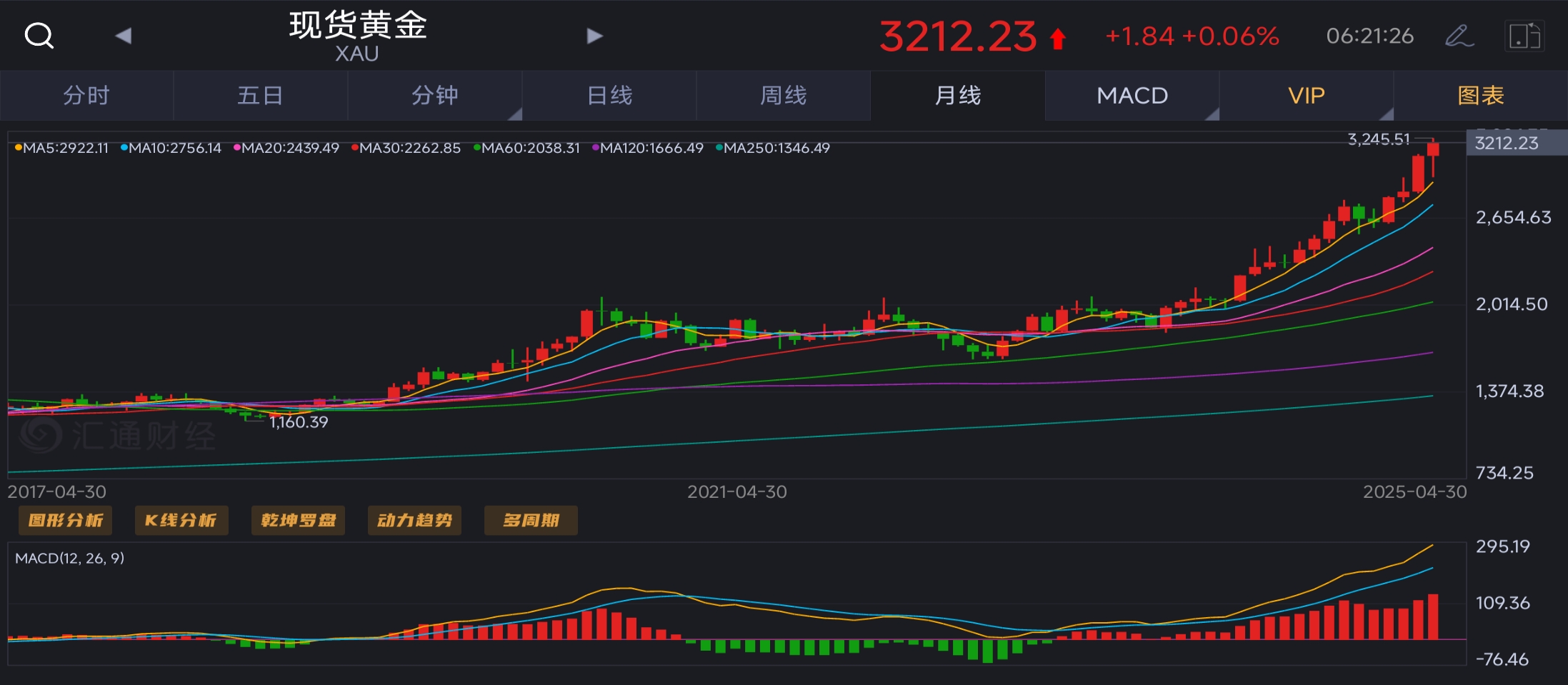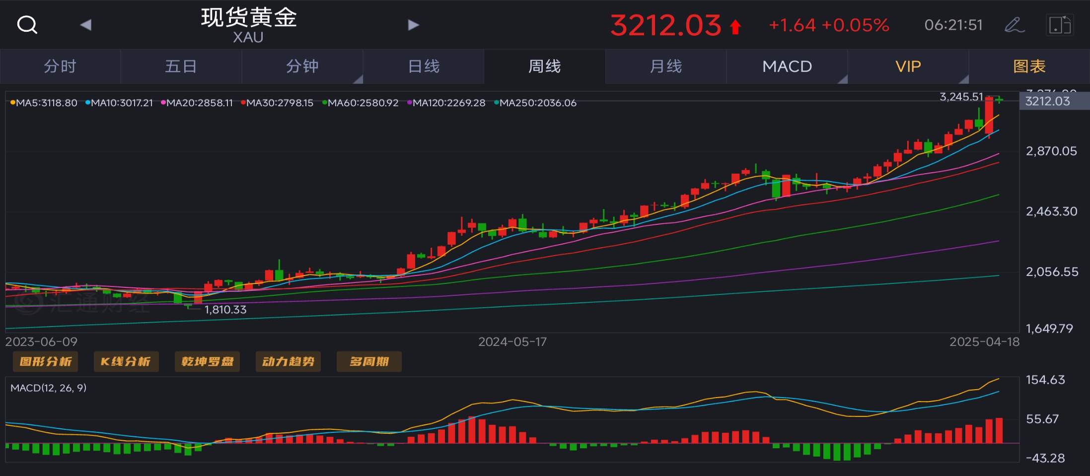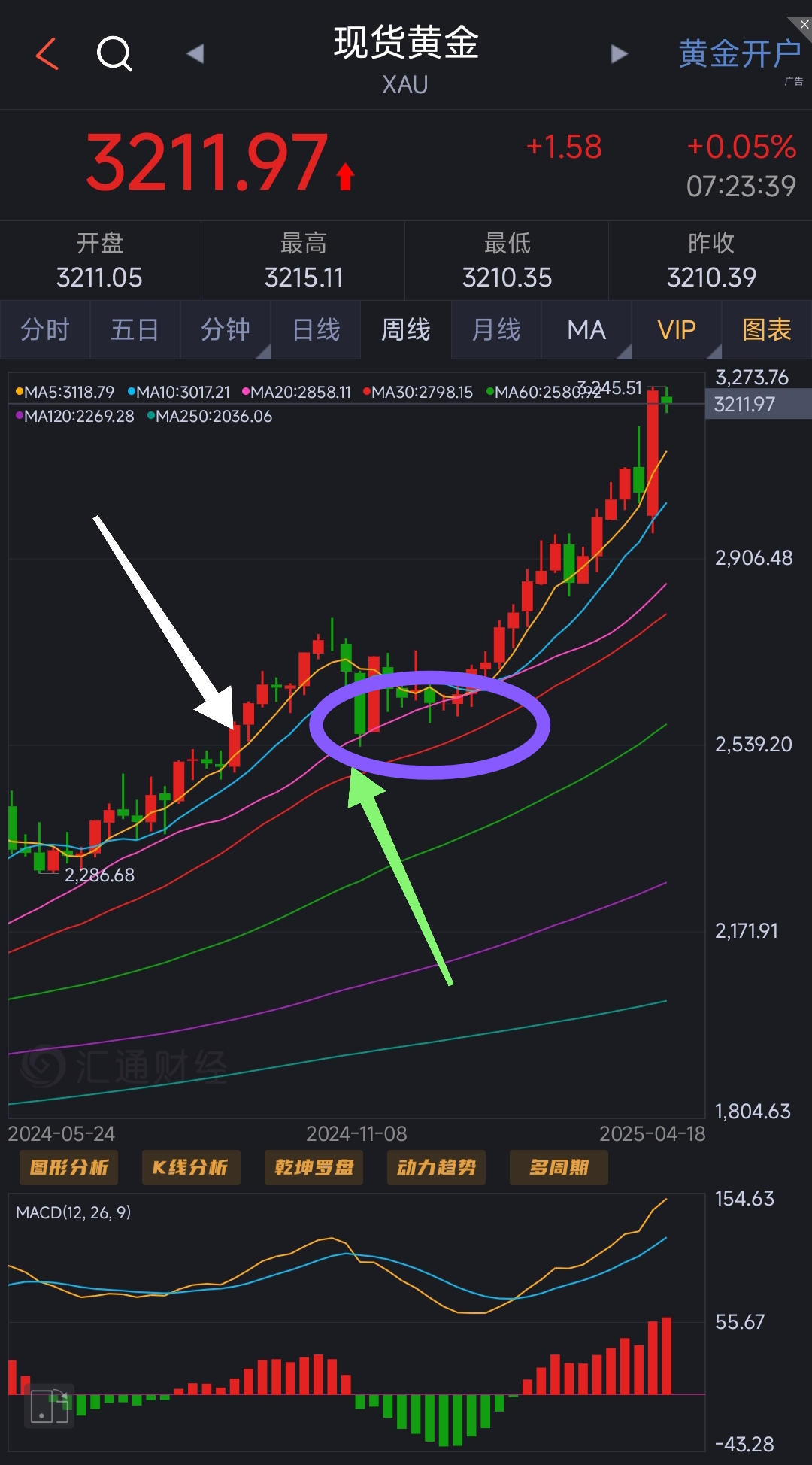 这幅年k线图形是常规的均线 macd,这幅图中看到的信息就是2023年、2024年、以及2025年至今的黄金是连续上涨的,并且当前的价格在5年均线上放900多点,在10年均线上方1400点,这个提示了当前价格没有受到5年均线及10年均线的支撑,意味着做多的获利盘非常多,随时平仓他们也会有丰厚的收益。显然也是不符合年线级别大行情起点的特征。