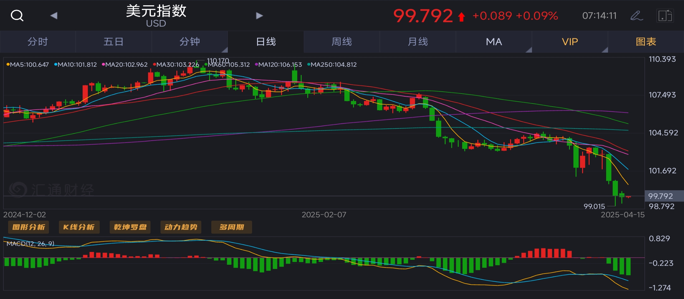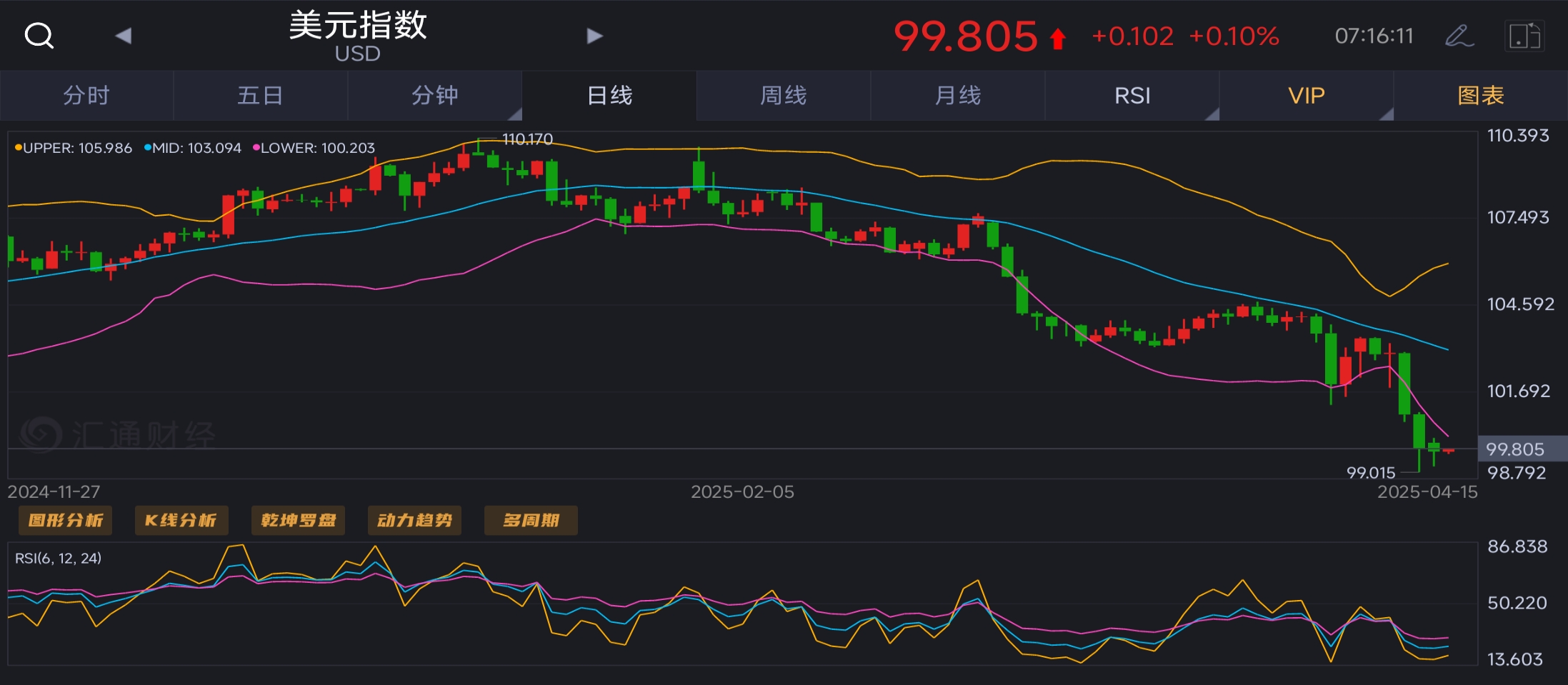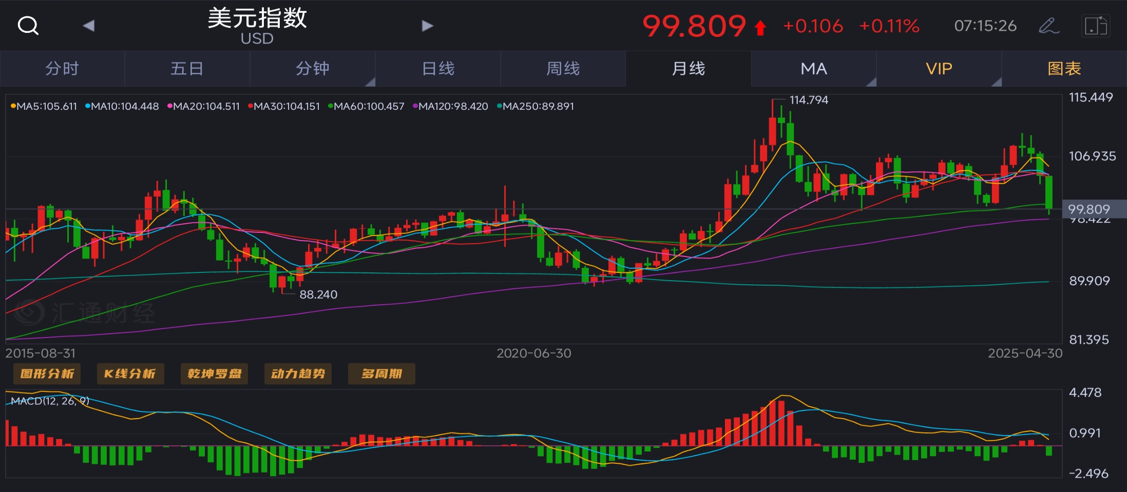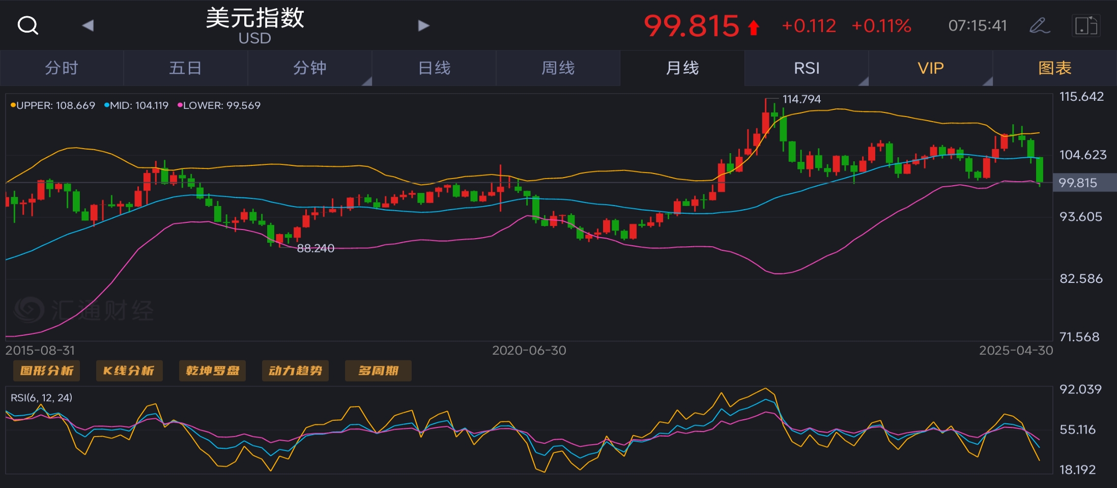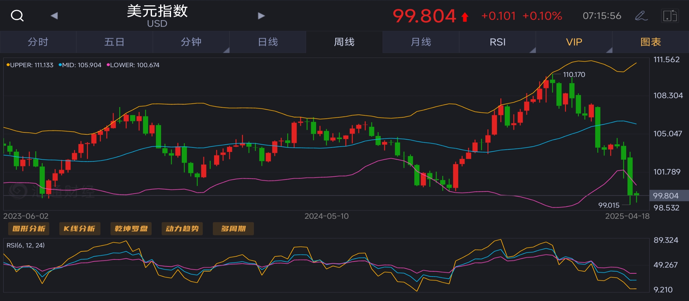从110点的高位跌到99点,短期内跌幅达到10%,对于大国汇率来说这是一个比较大的跌幅,通常会反弹到 104~103点附近。