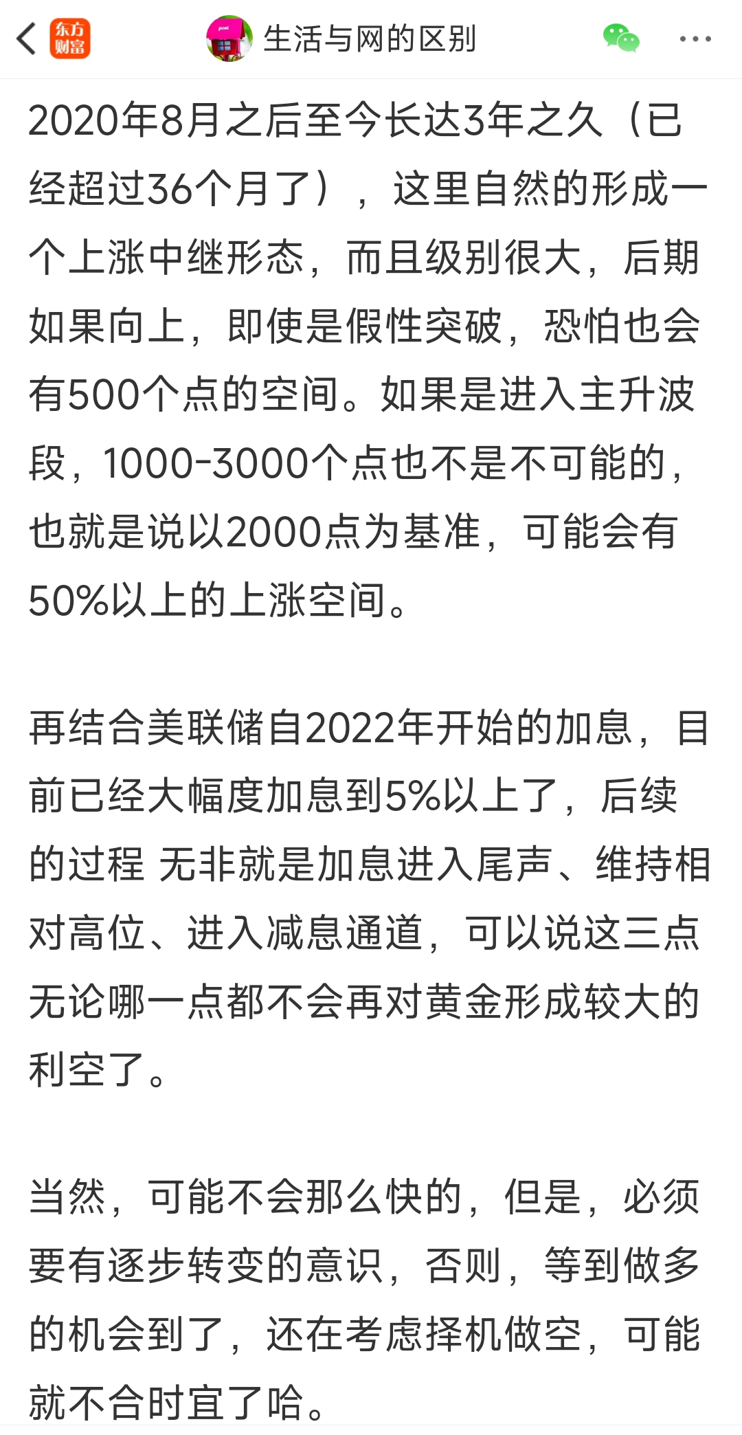从这个帖子的内容及留言可以看出几点:第1点,我当时的观点是在自己分析的基础上形成的,属于我的原创。第2点,我认为当时的月k线图形是上涨中继,现在已经大涨了,当然被验证是正确的。第3点,尽管当时在1900点附近,但是我说的是以2000点为基准,即使向上假性突破也有500点的上涨空间。第4点,如果向上突破进入主升浪,可能会有1000~3000个点的上涨空间,也就是说至少有50%的涨幅。(就凭这一点,可以碾压99.9%的 外国大投行 诸如高盛、摩根大通、瑞银、摩根士丹利等![笑哭 [笑哭]](http://gbfek.dfcfw.com/face/emot_default_28x28/emot39.png)