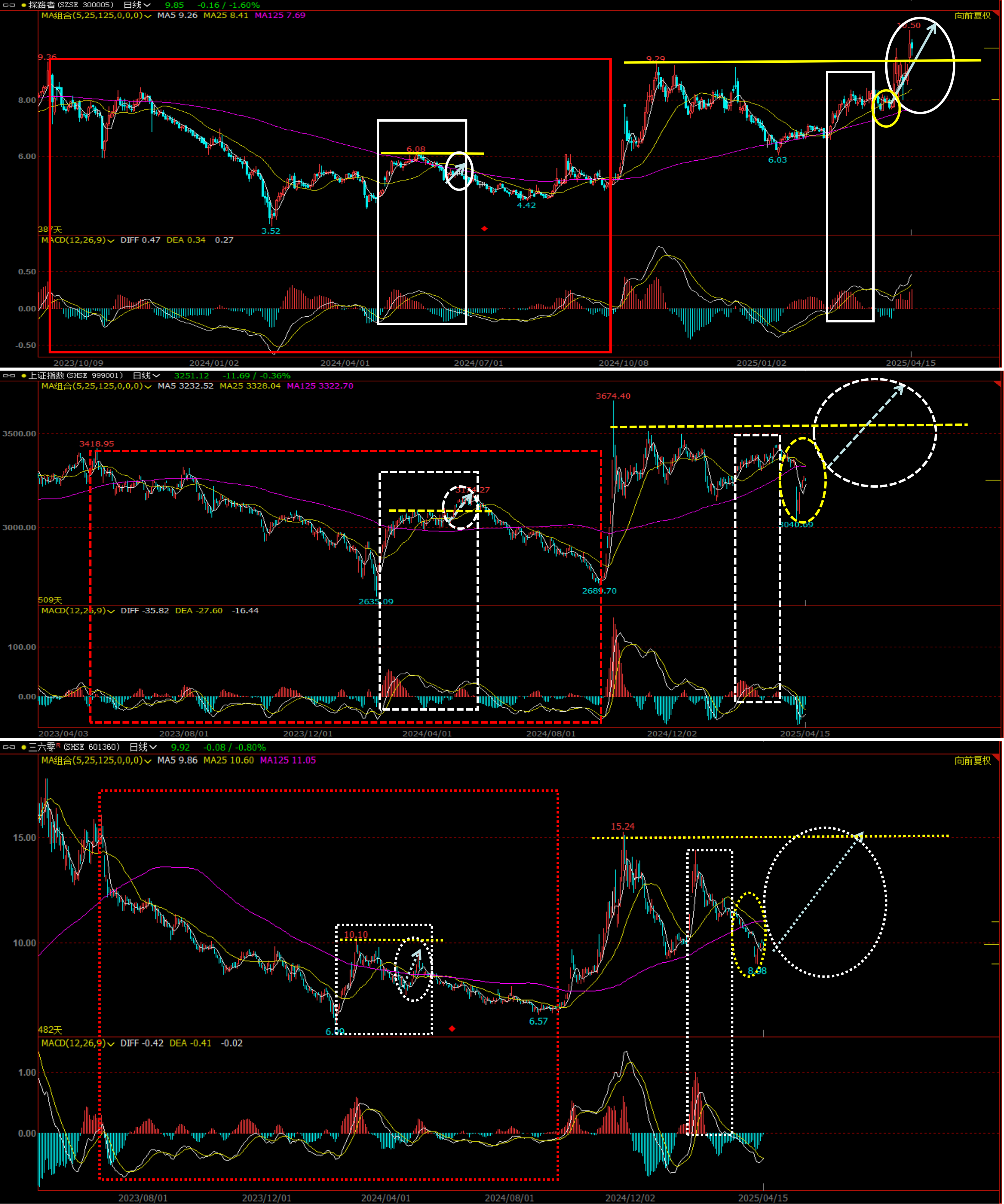 三六零的白色虚线圈圈和白色虚线箭头,相比而言虽然比不过上证指数,但是却也比探路者强的多。而且三六零的黄色虚线圈圈处的回调暴跌洗盘也是有足够深度的。你如果今天清仓探路者,换股到三六零,不但可以探路者获利了结,而且可以低位建仓到一个潜力较大的股票上面。具体换股品种可以找其他的,主要选股原则就是白色圈圈处的“最后一波上涨”越强劲越好。