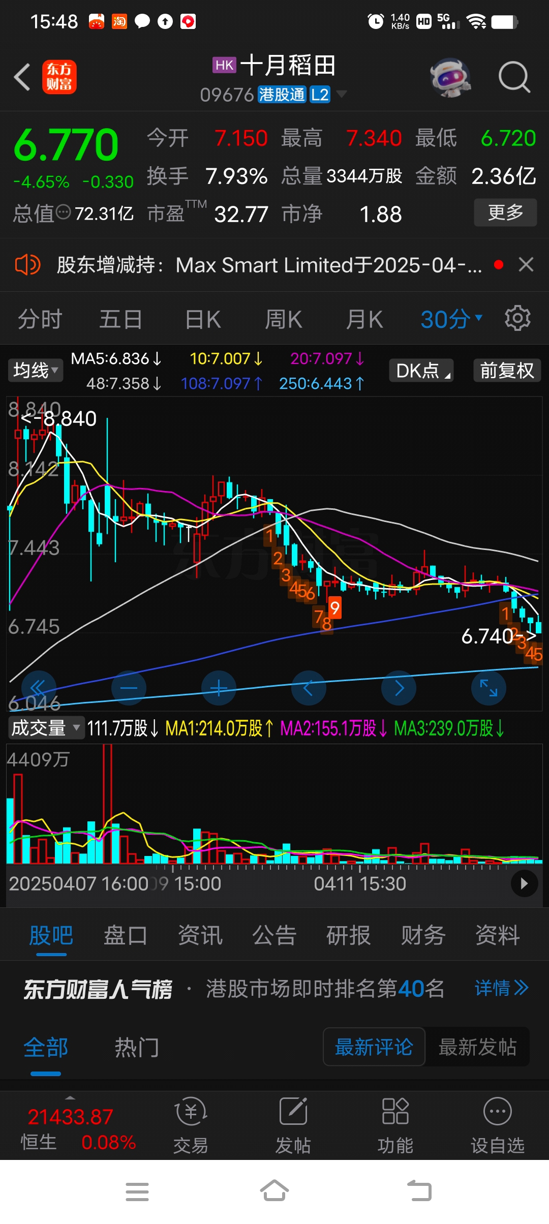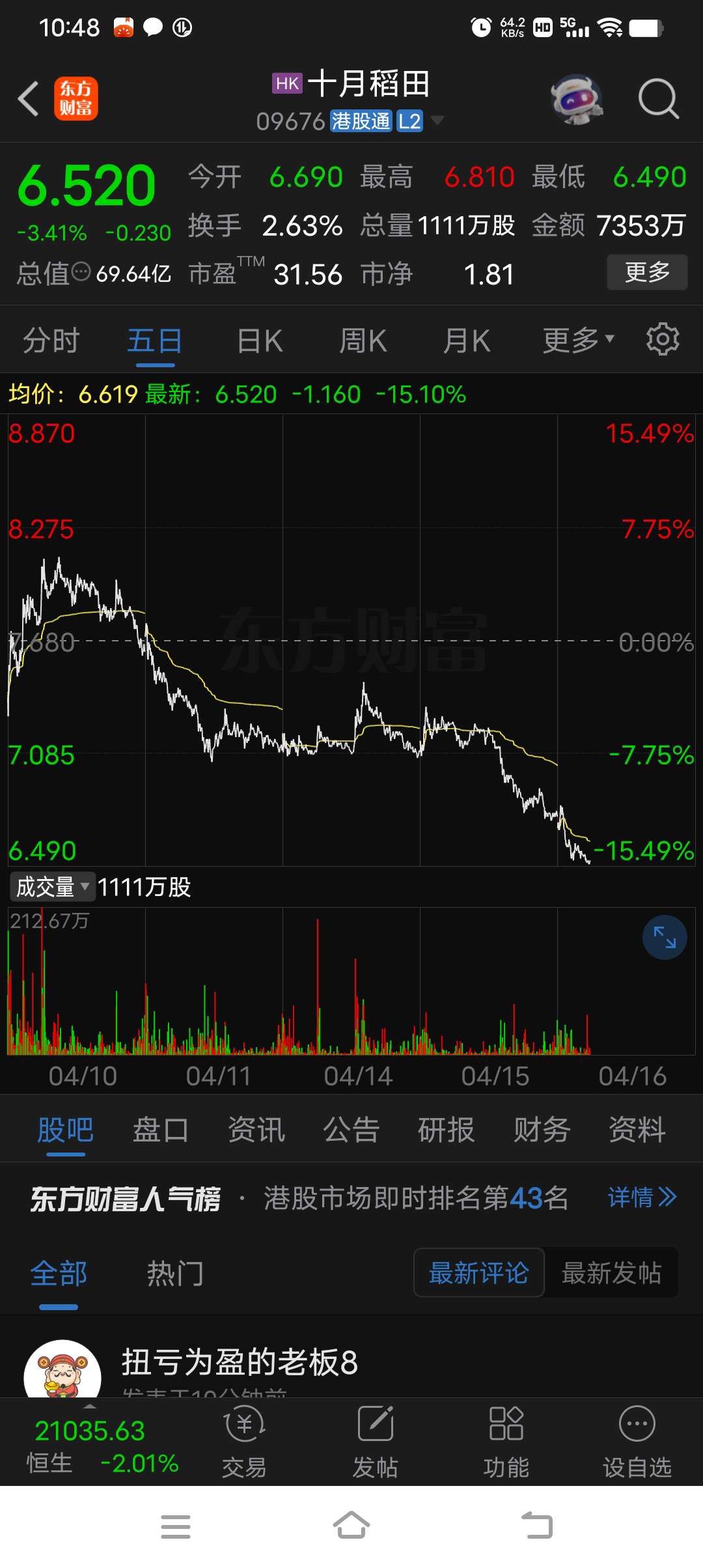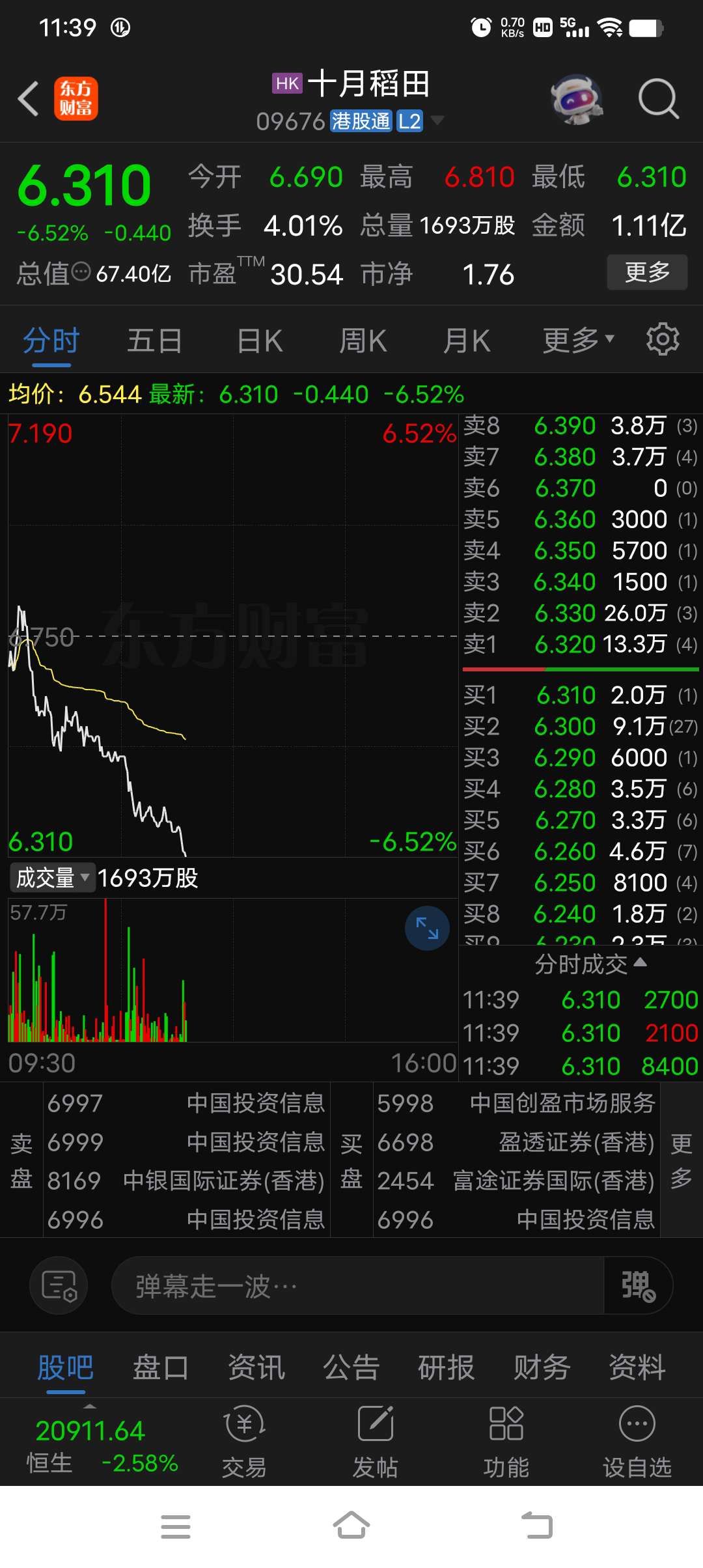 十月稻田(09676)现跌超6%,截至发稿,跌5.63%,报6.37港元,成交额1.19亿港元。
