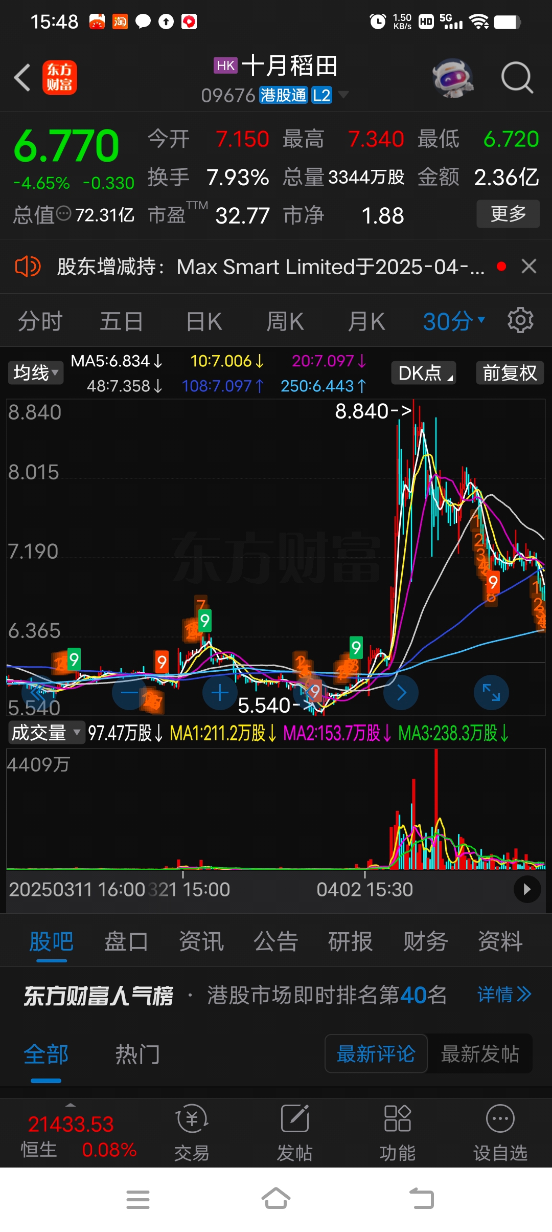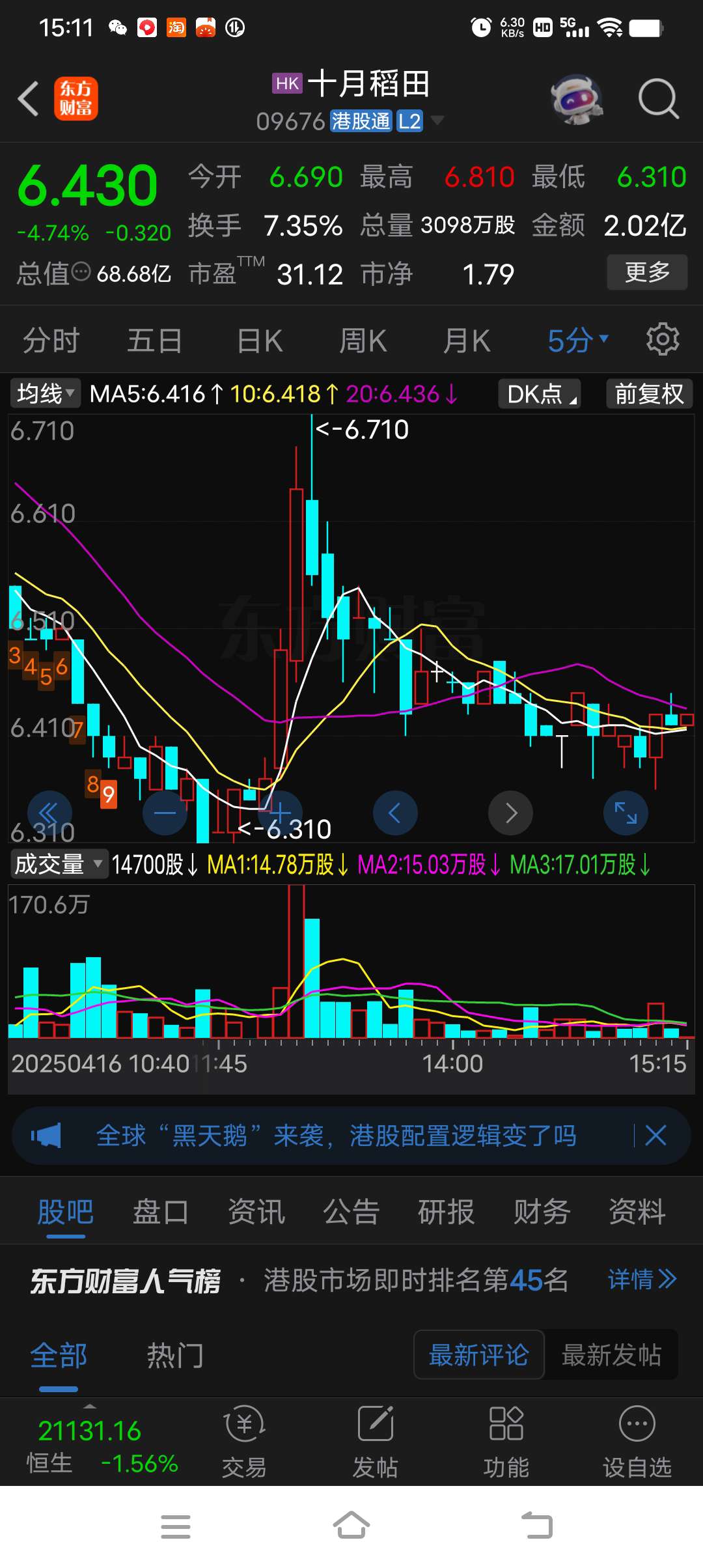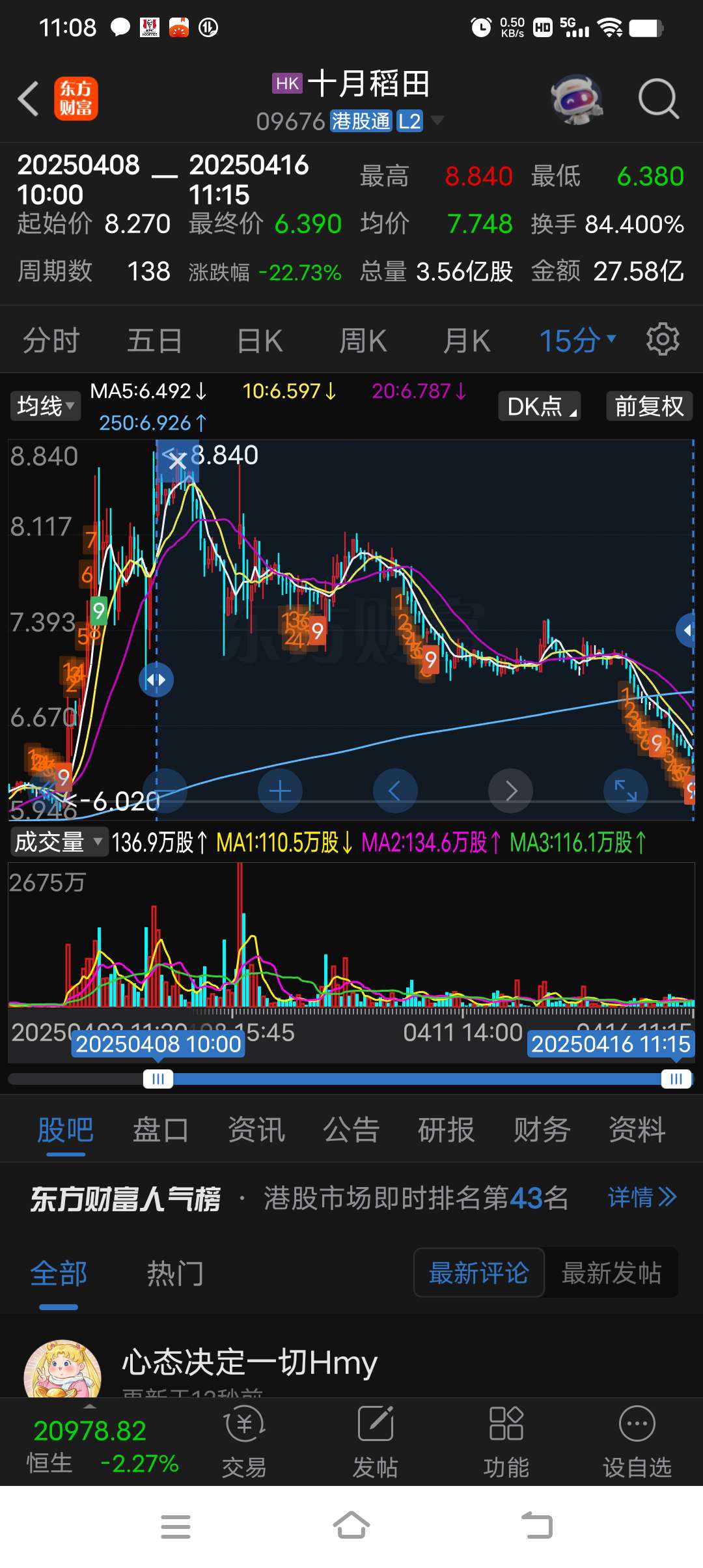 十月稻田(09676)现跌超6%,截至发稿,跌5.63%,报6.37港元,成交额1.19亿港元。