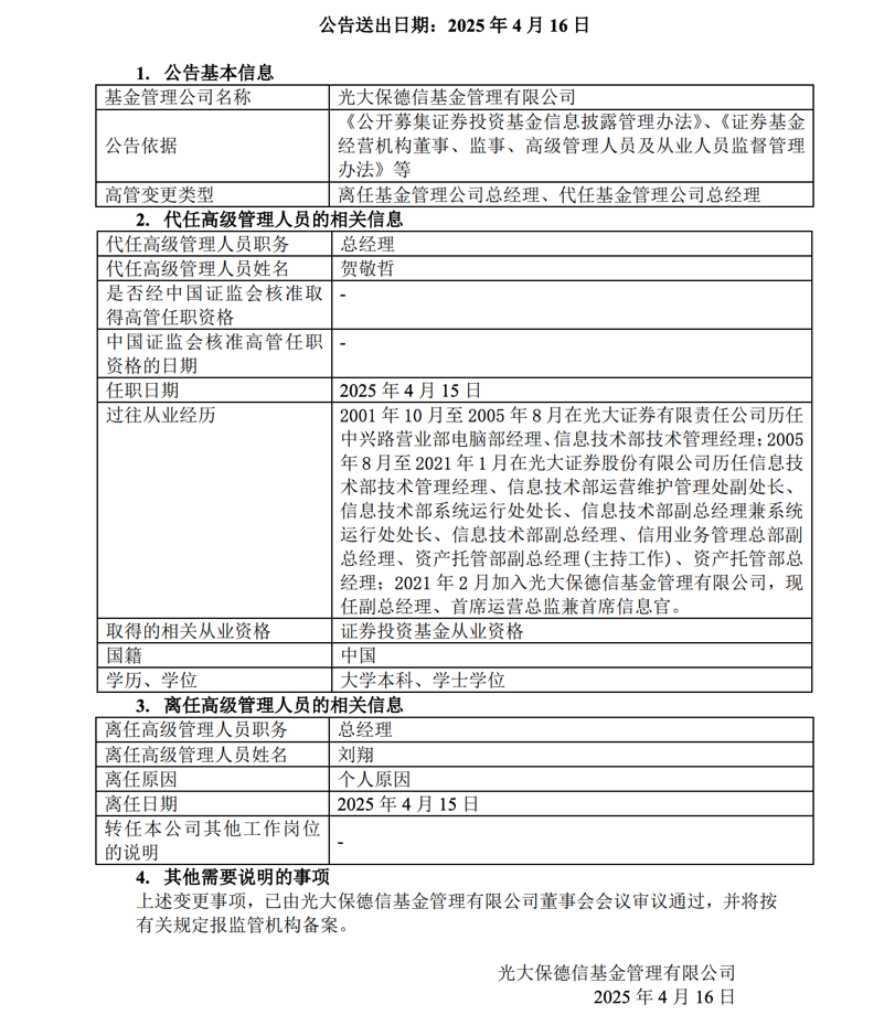 4月16日,知名合资公募基金公司光大保德信基金发布的公告称,公司总经理刘翔因个人原因辞任,公司副总经理、首席运营总监兼首席信息官贺敬哲将代任总经理职务,任职日期始于4月15日。光大保德信基金称公司经营一切正常。