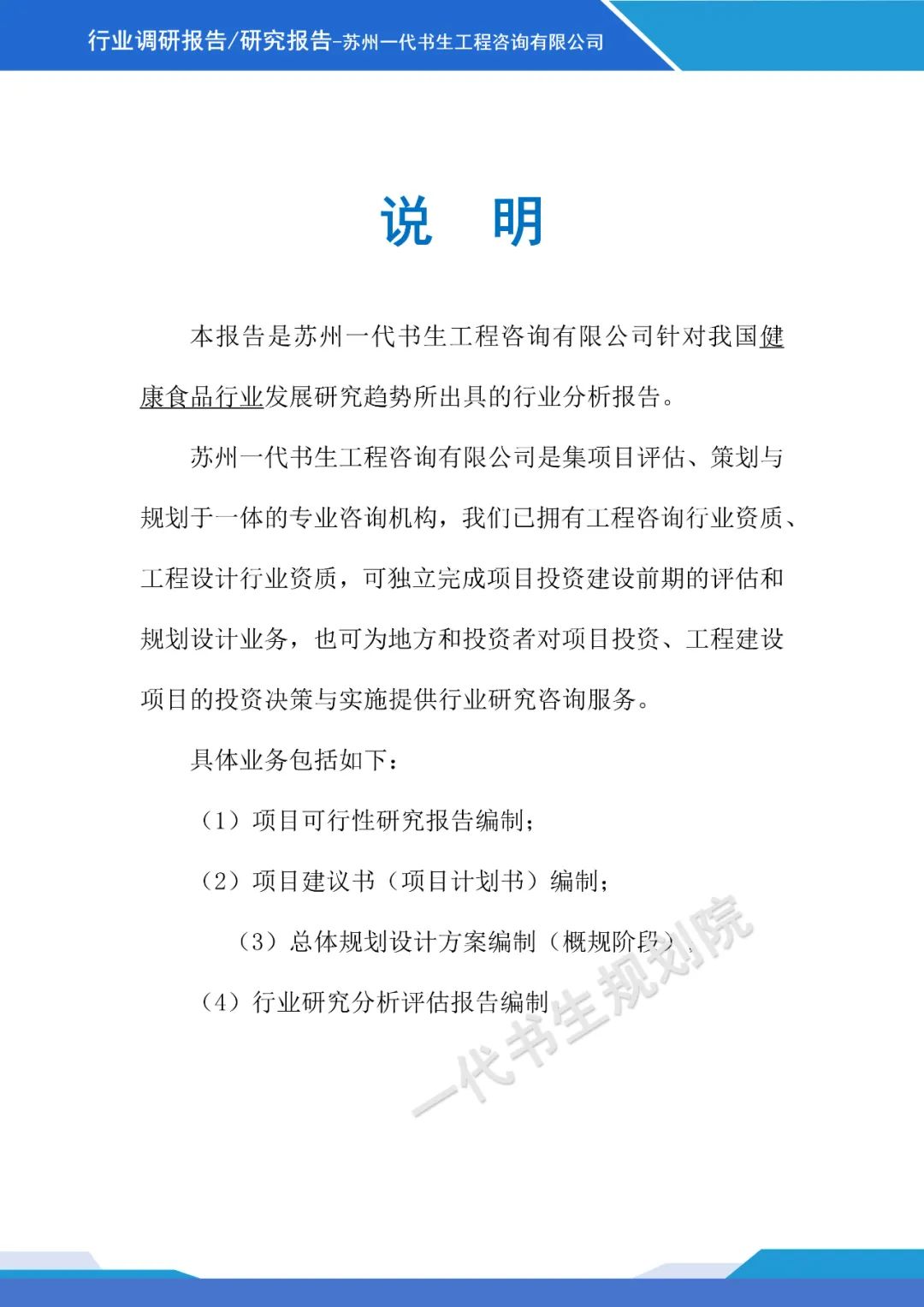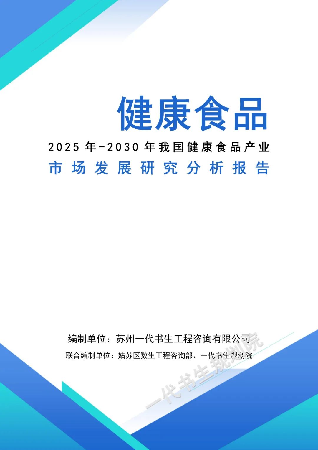 以下《2025年-2030年我国健康食品行业市场调研评估报告》由苏州一代书生工程咨询有限公司评估编制与发布。