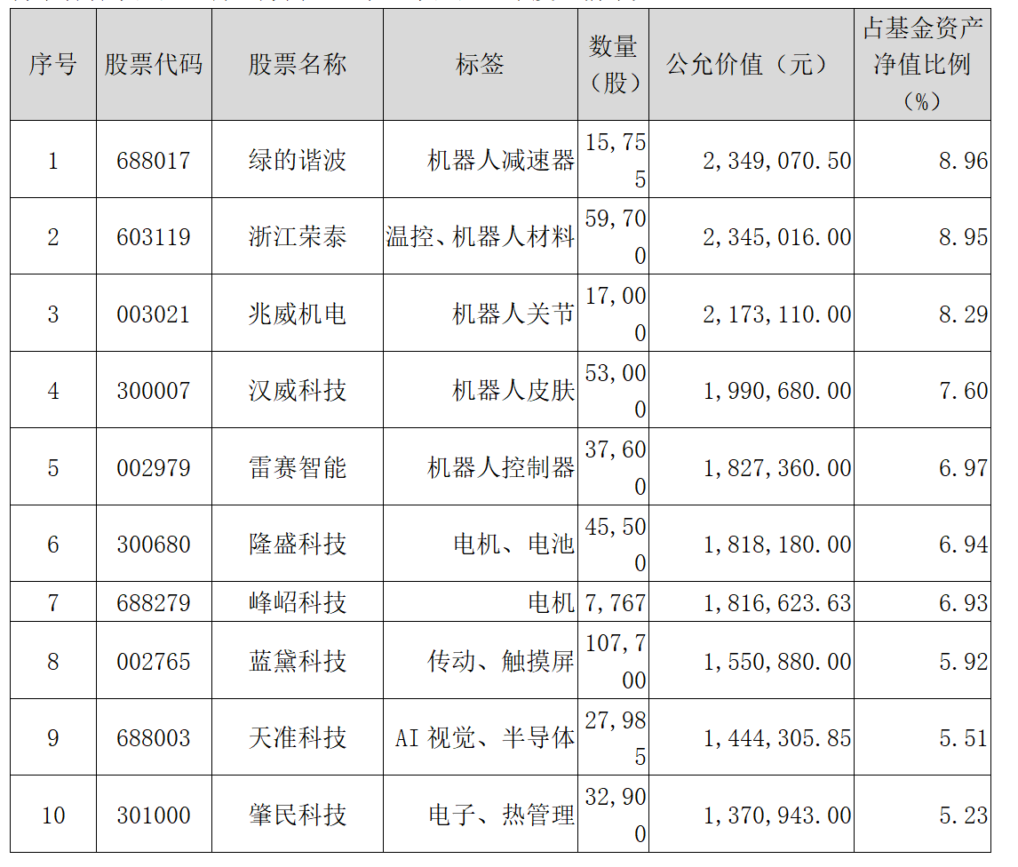 可以看出一季度的持仓方向主要在人型机器人相关领域,包括机器人的传感器、减速器、关节、材料、电机、芯片等等细分板块。