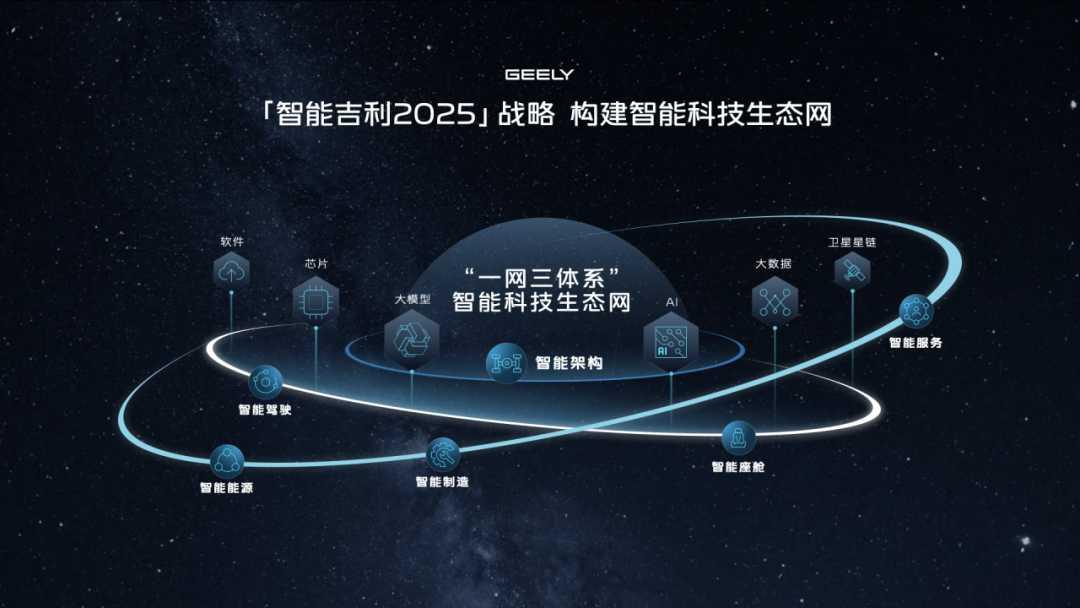 早在2021年初,吉利就提出了“两个蓝色吉利行动计划”,一是主攻智能化节能与新能源汽车行动,二是主攻智能纯电动汽车。两个计划均以全面智能化为基础,奠定了吉利向智能化全面转型的基调。同年,吉利“智能吉利2025”战略发布,打造“一网三体系”,目标是要在电动汽车智能化领域实现全面领先,借助大算力、大数据、大模型、卫星星链等科技新基建,编织出一张“智能科技生态网”,为智能化发展,筑牢技术底座。