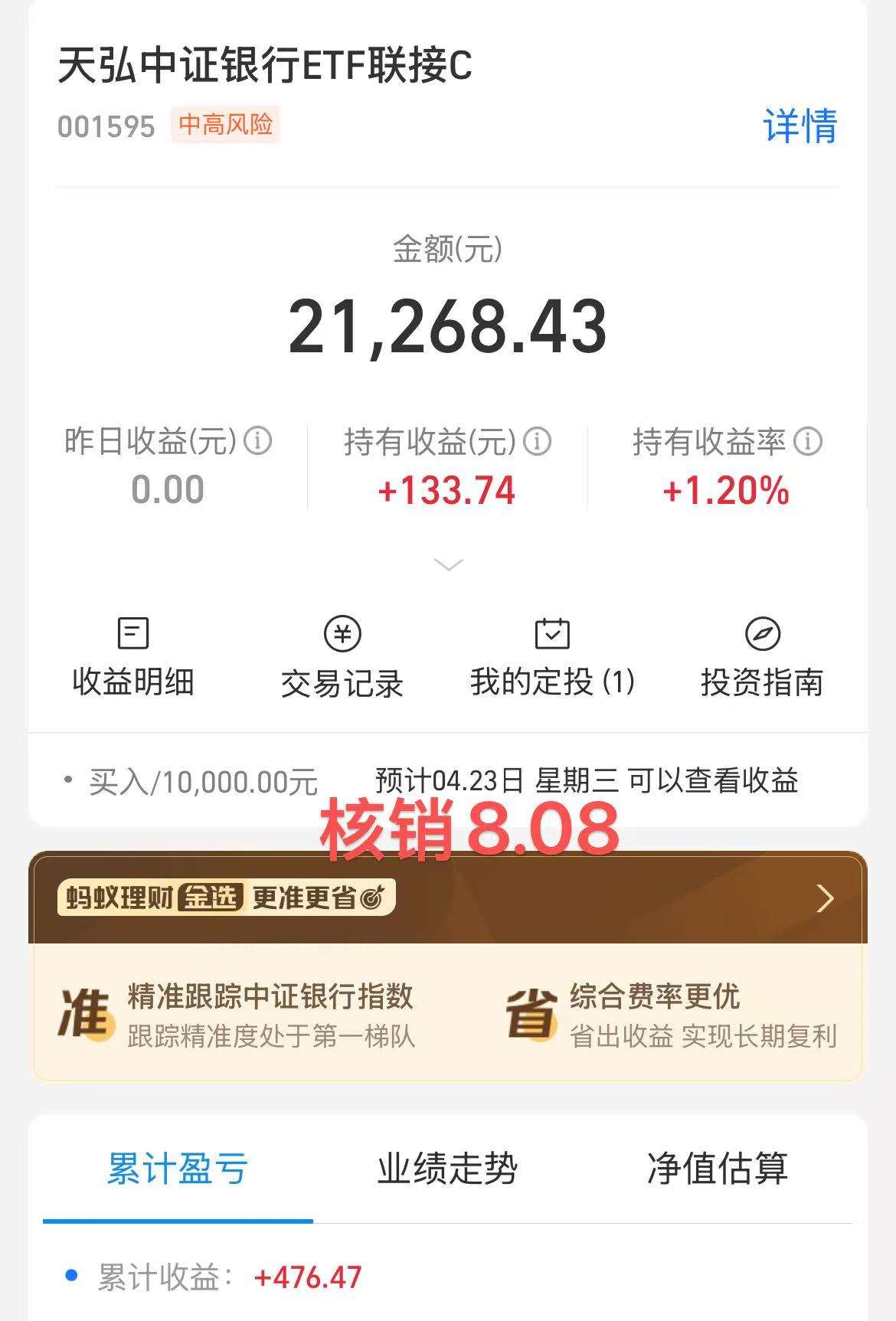 定投操作:$天弘中证银行ETF联接C$+10000元核销8元红包,银行这只只要跌了我就会买的,明天跌了就翻倍买!